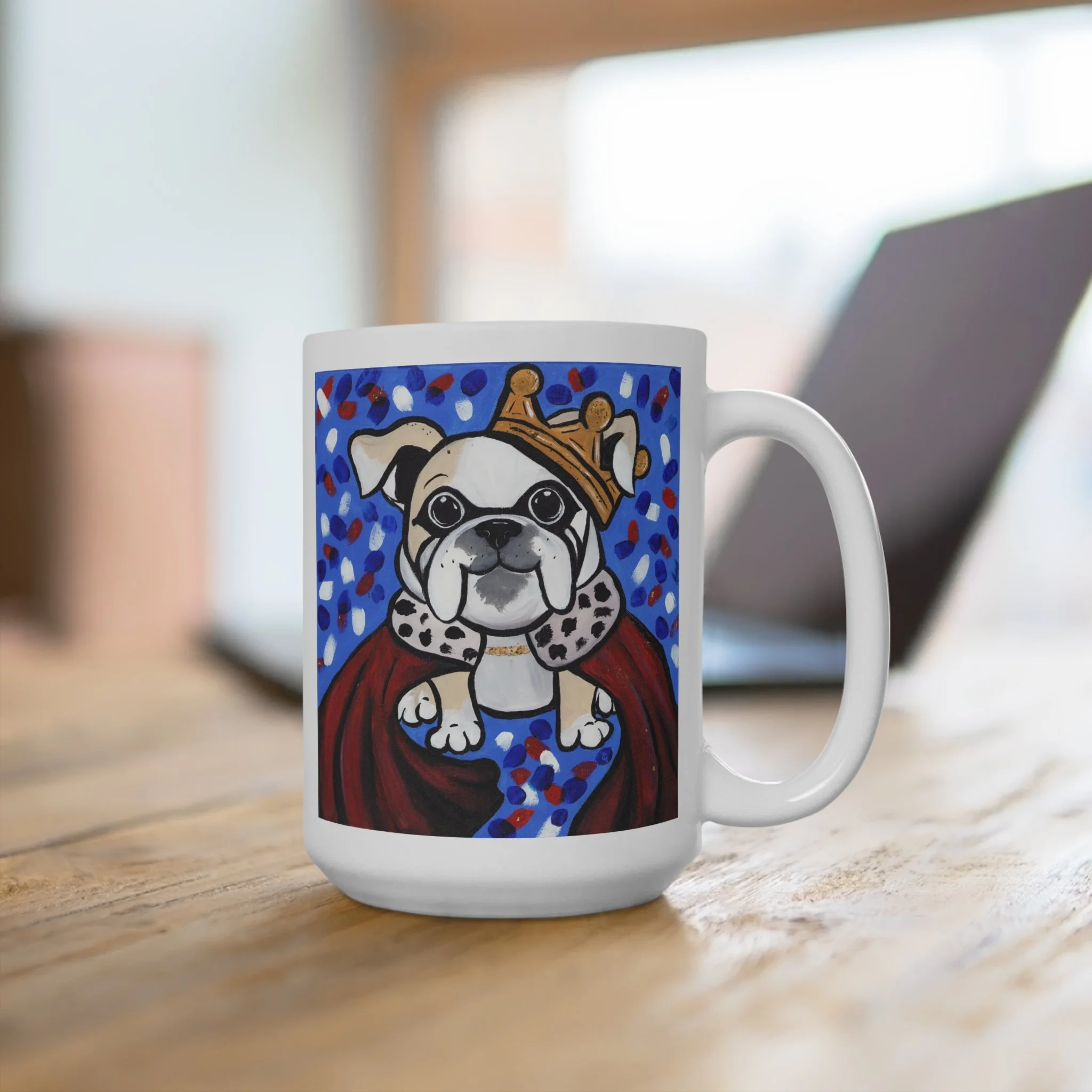 Warmth in your hands and a grin in your morning—this 15oz ceramic mug features a joyful, crowned bulldog rendered in bold, playful colors. The cartoon-like portrait sits against a lively confetti background, bringing a lighthearted, confident energy to coffee breaks, desk hours, and slow weekend mornings. It feels like a small, cheerful companion: sturdy, straightforward, and unapologetically bright. Bring it out when you need a mood lift, to celebrate a furry friend, or to add a splash of color to a neutral kitchen.