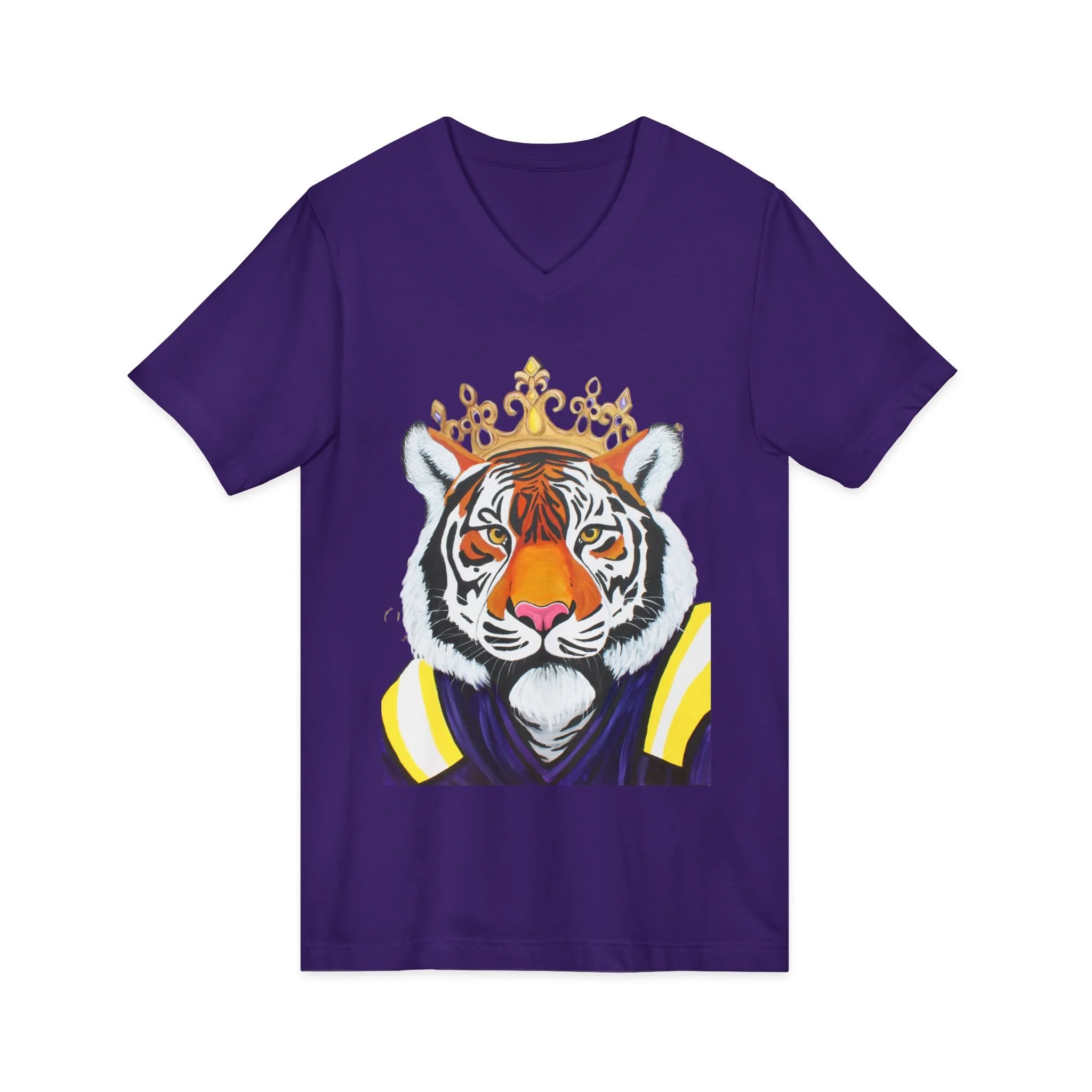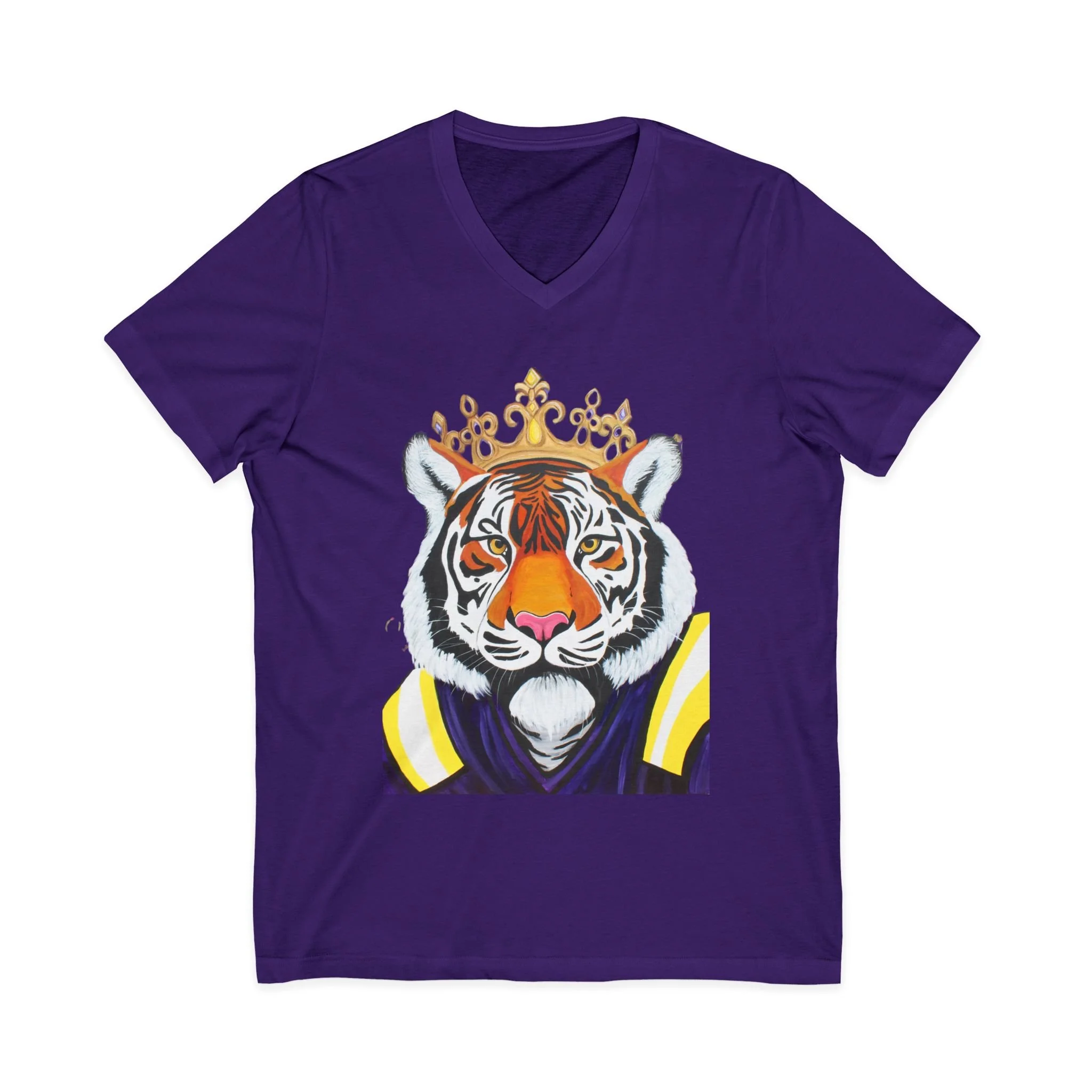 This lightweight V-neck tee features a bold, regal tiger illustration — a modern mix of fierce energy and playful street-art color. The crown-wearing tiger print pops against deep purple fabric, giving the shirt an athletic, confident look that still feels wearable every day. Breathable 100% cotton (or soft heather blends) keeps the fit light and comfortable while the V-neck and retail cut add a flattering silhouette. Ethically made with attention to quality details like side seams, ribbed collar, shoulder tape, and a tear-away label, this tee blends standout style with lasting wear.