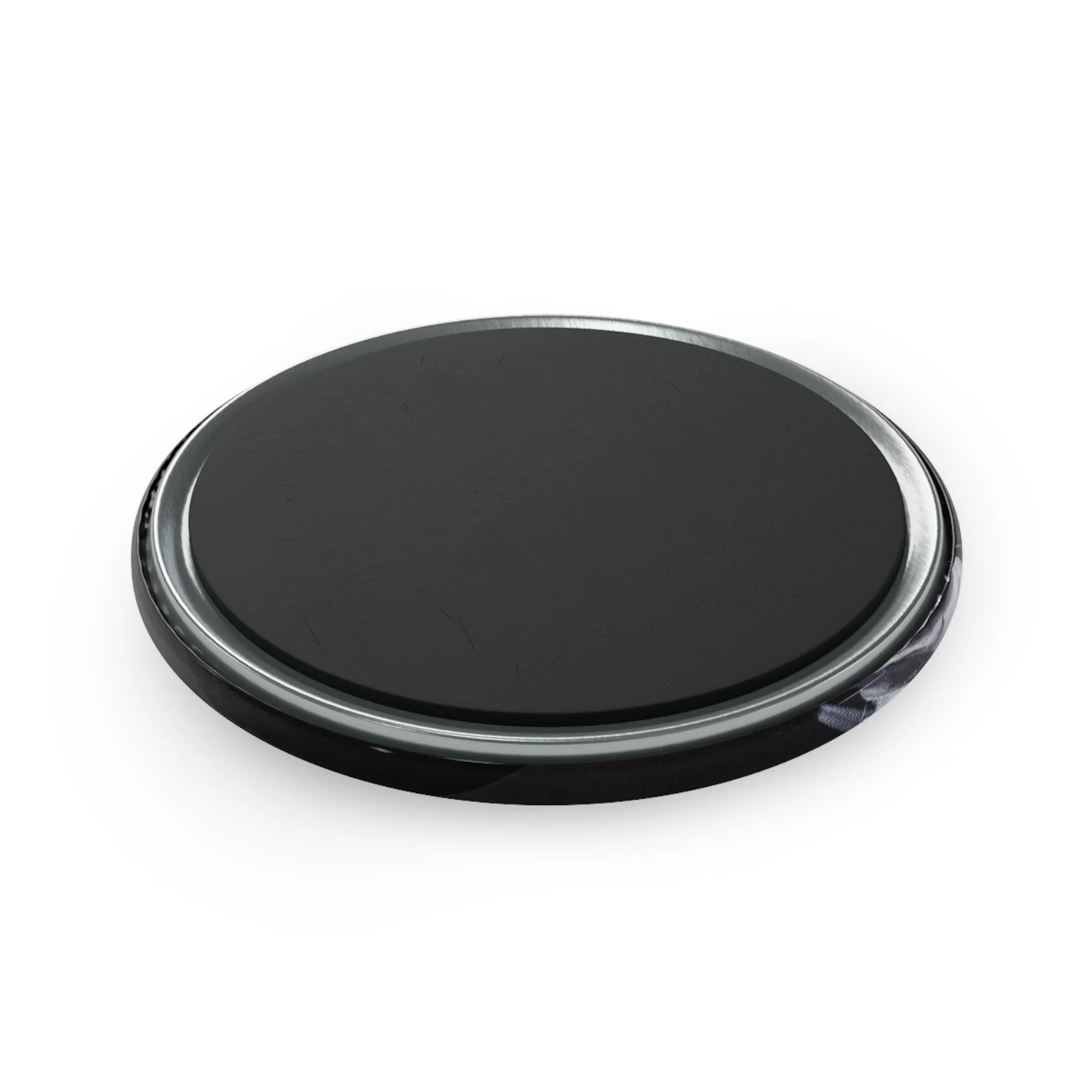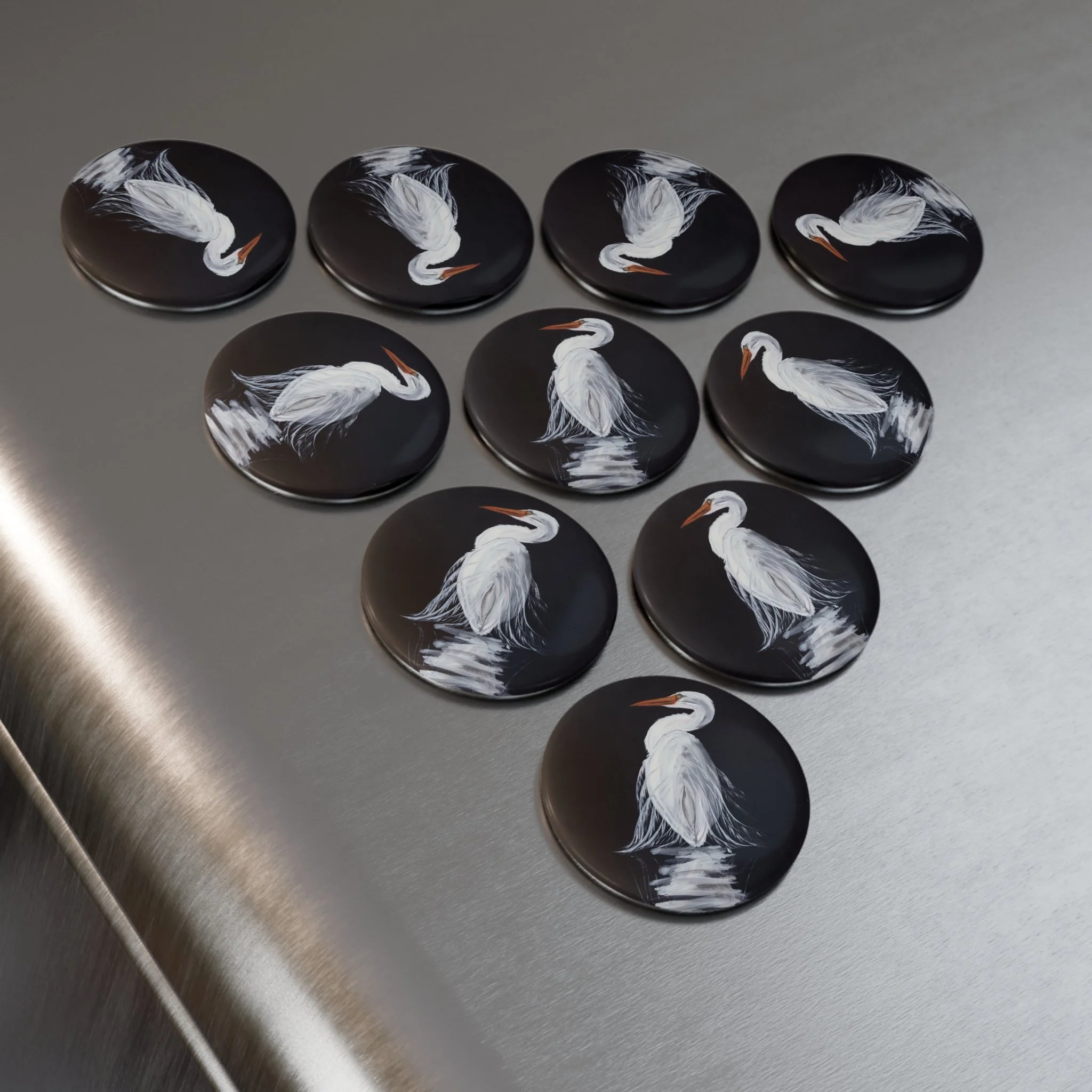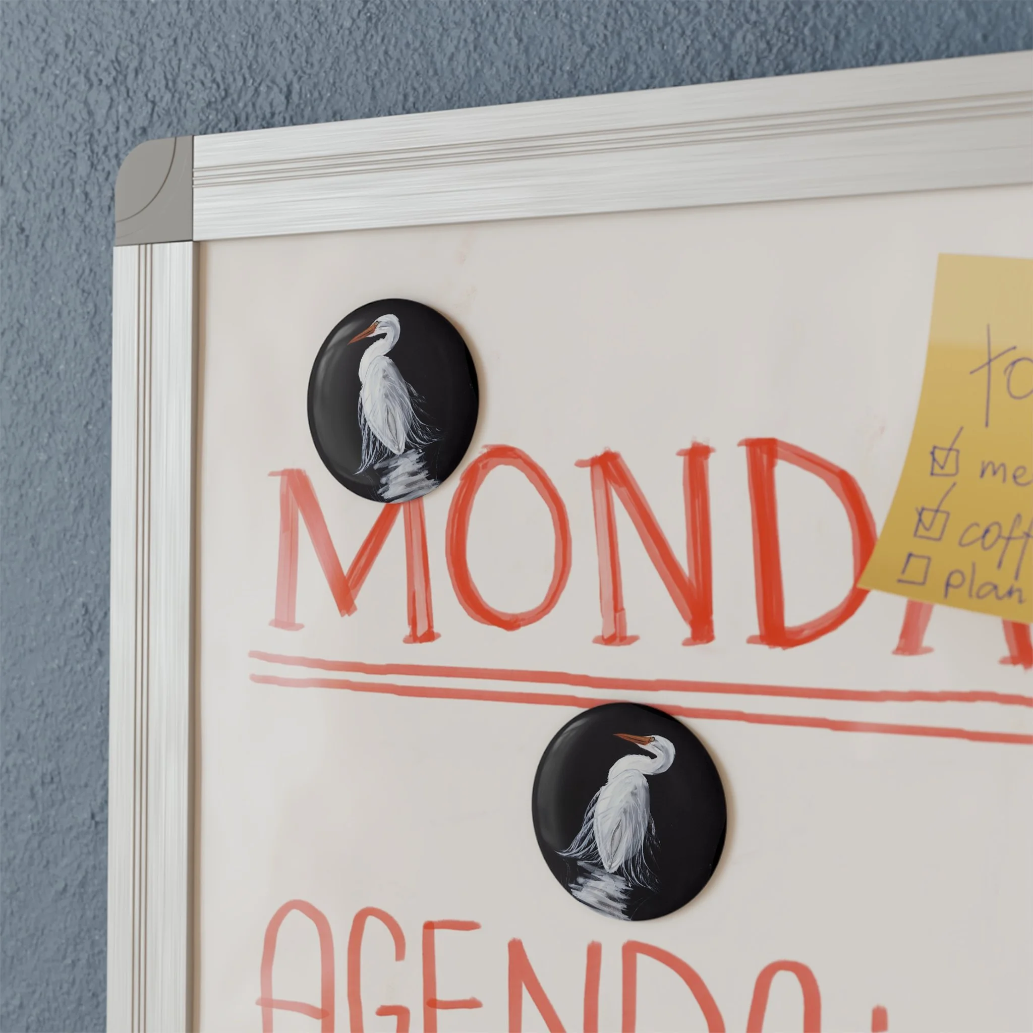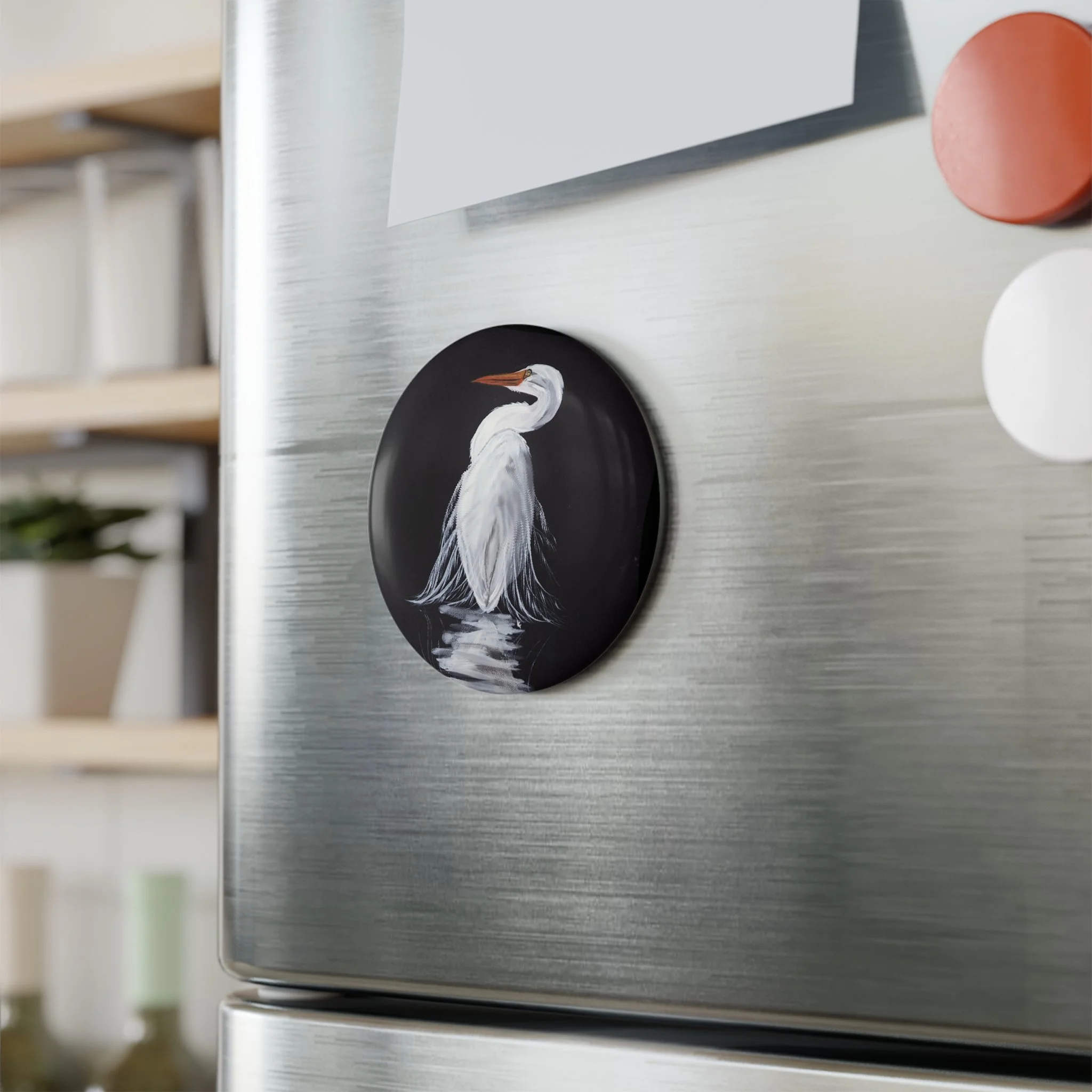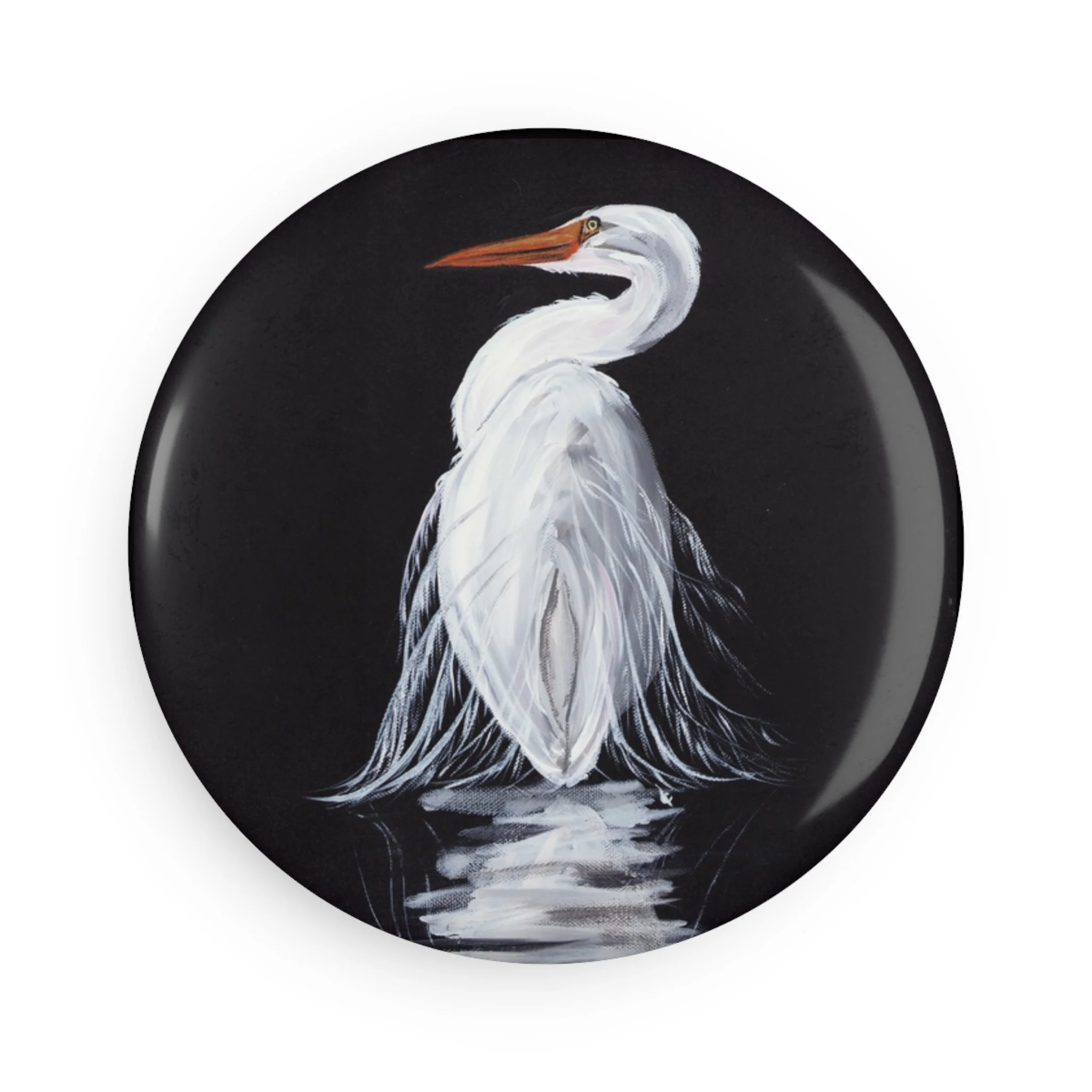 A small, artful round magnet that brings a quiet moment to everyday spaces. The hand-painted egret design sits against a deep black background, its feathery white form and reflected water details rendered with vivid contrast. The metal shell and flat magnetic backing make it sturdy on metal surfaces, while the clear mylar/UV cover keeps the colors bright and guards against scratches. Keep one on the fridge to hold notes or cluster several on a metal board to create a tiny gallery of coastal calm.