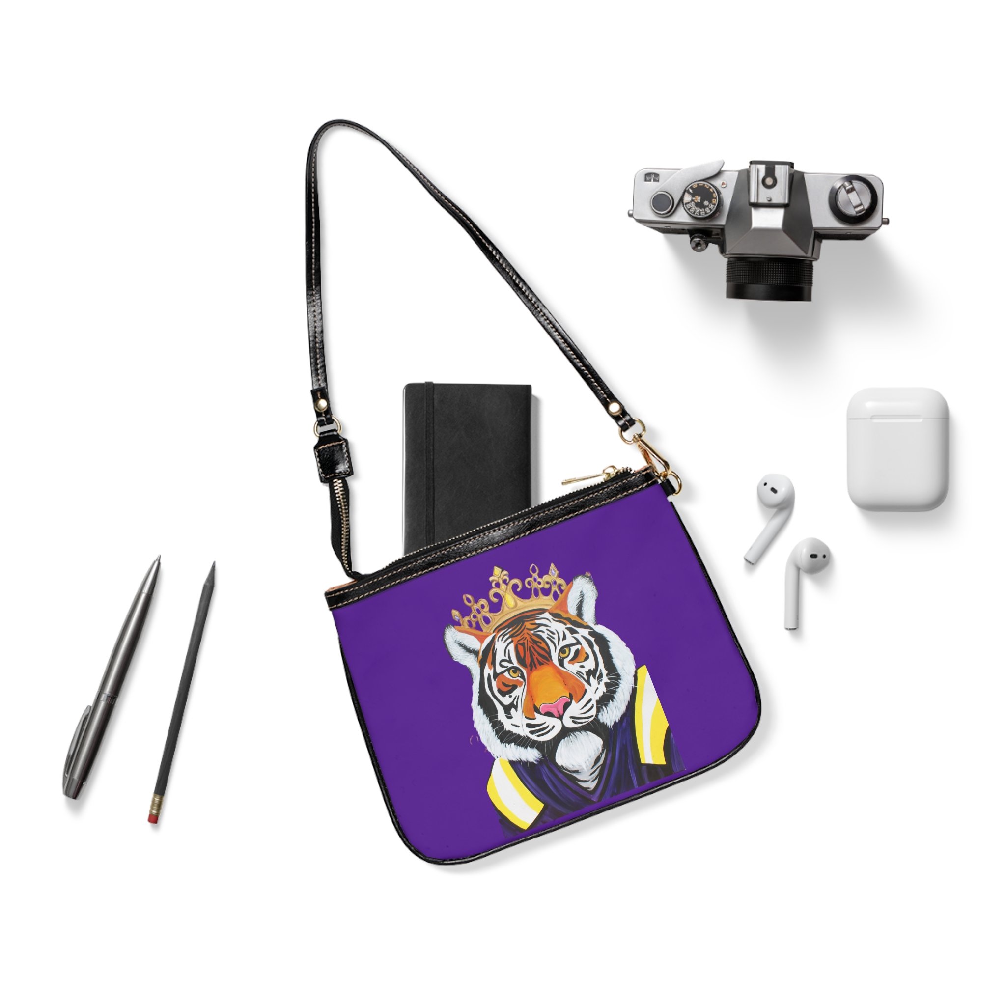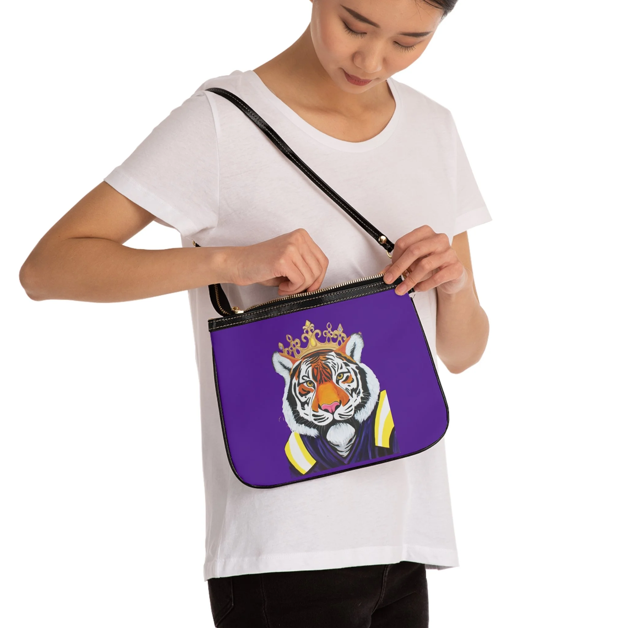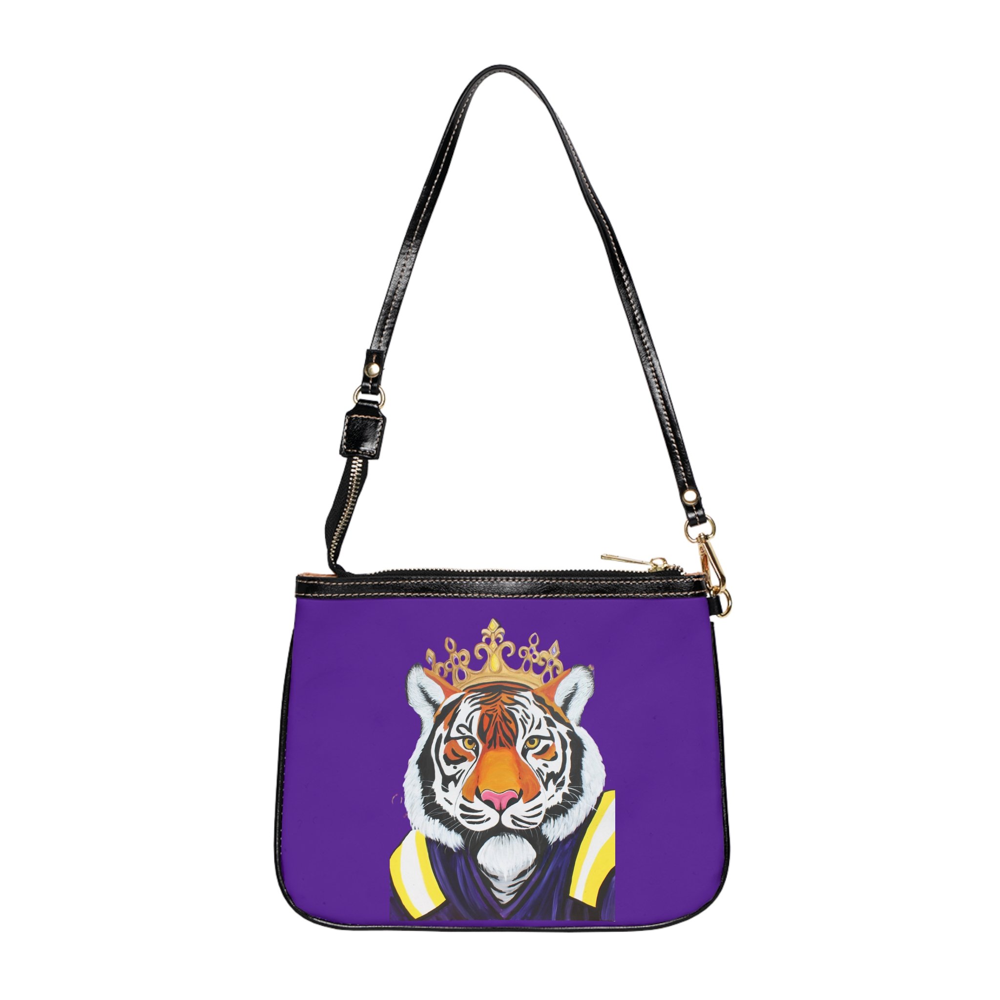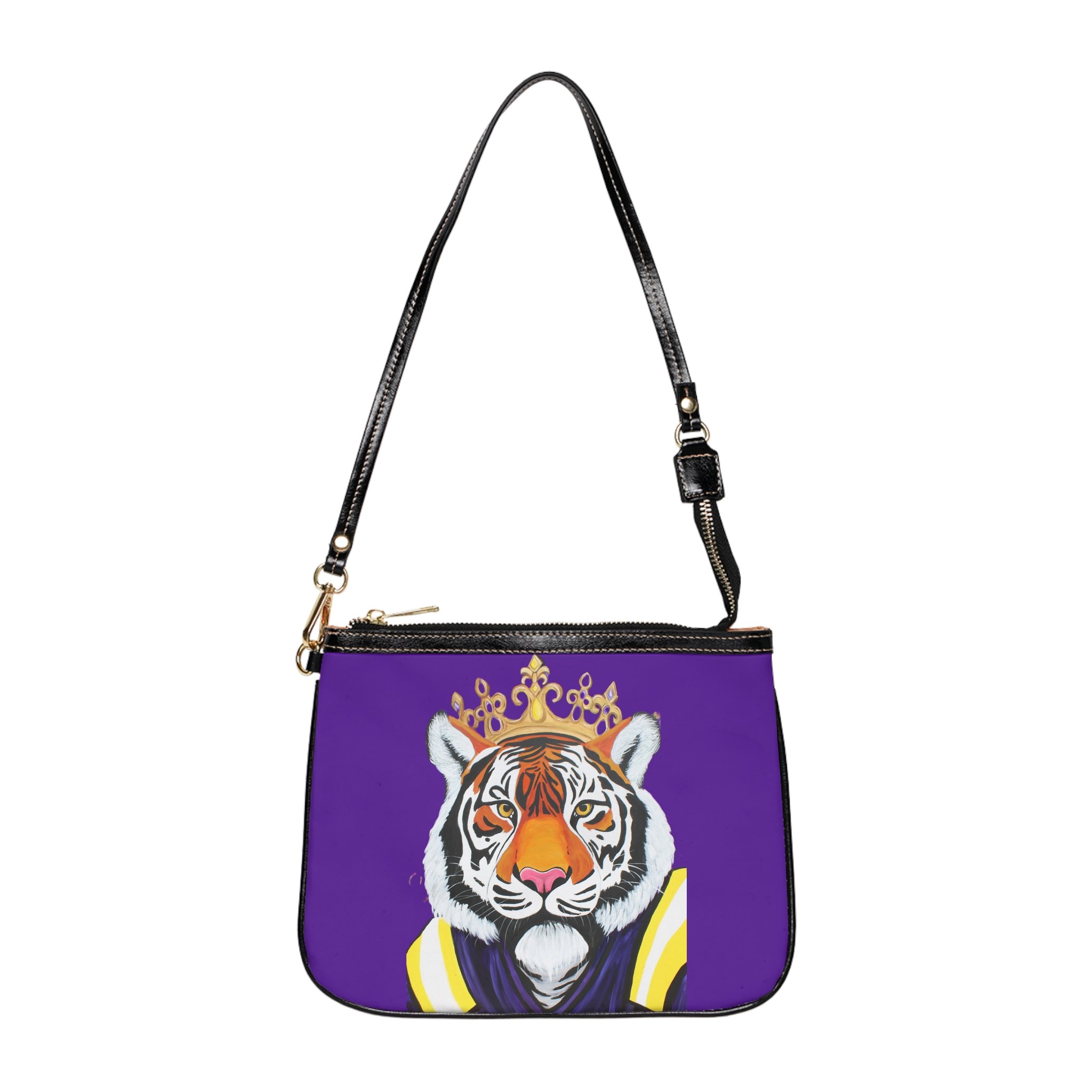 A bold small shoulder bag that brings playful confidence to everyday outings. The front features a regal tiger illustration—crowned and poised—set against a vivid purple backdrop that makes the artwork pop. Lightweight and structured, the bag keeps essentials organized with two interior slip pockets and a smooth polyester lining. Gold-colored zipper and hardware add a touch of glam while the adjustable black strap keeps wear comfortable and versatile. Double-sided print keeps the design striking from every angle, so this little bag stands out whether you’re running errands, meeting friends, or slipping into an evening spot.