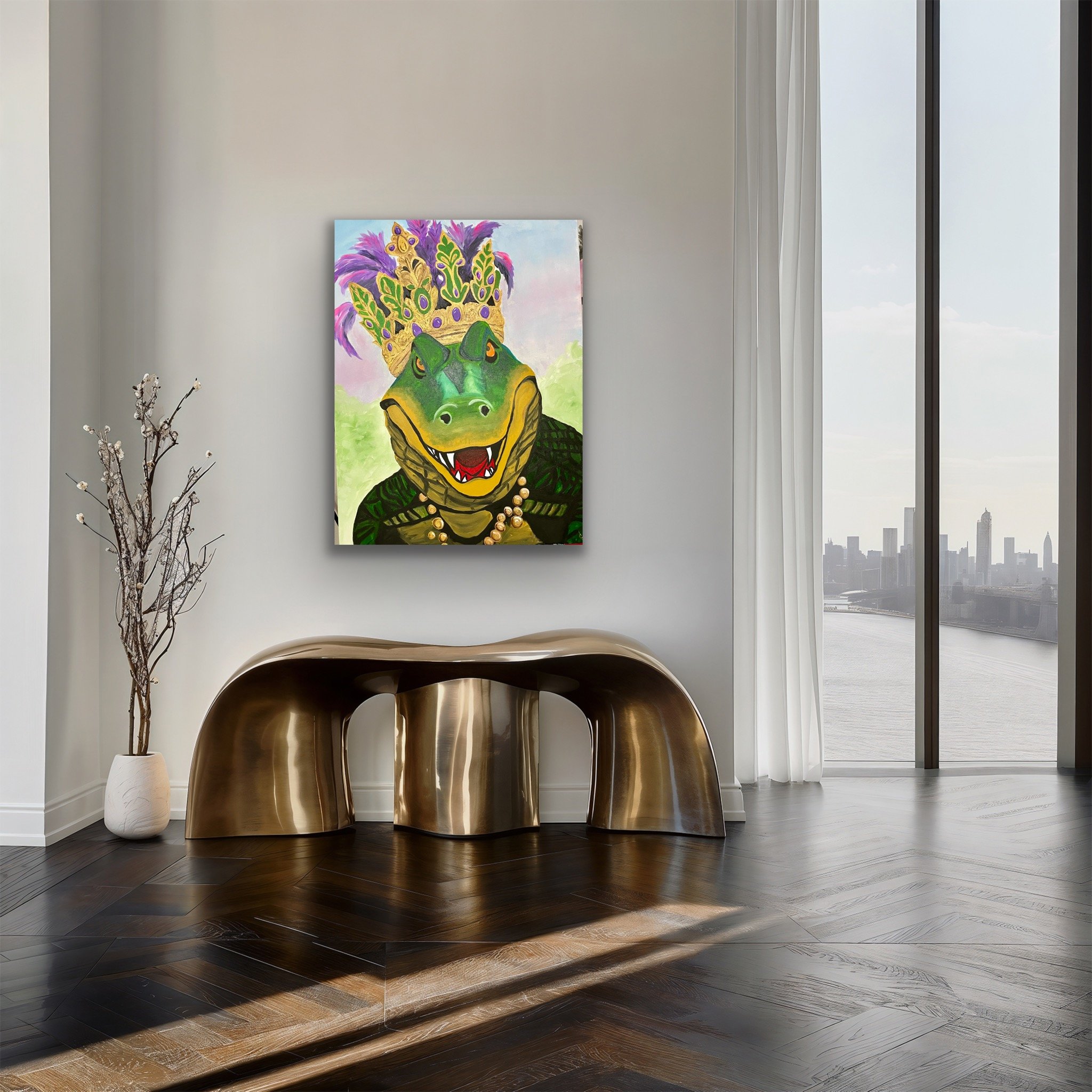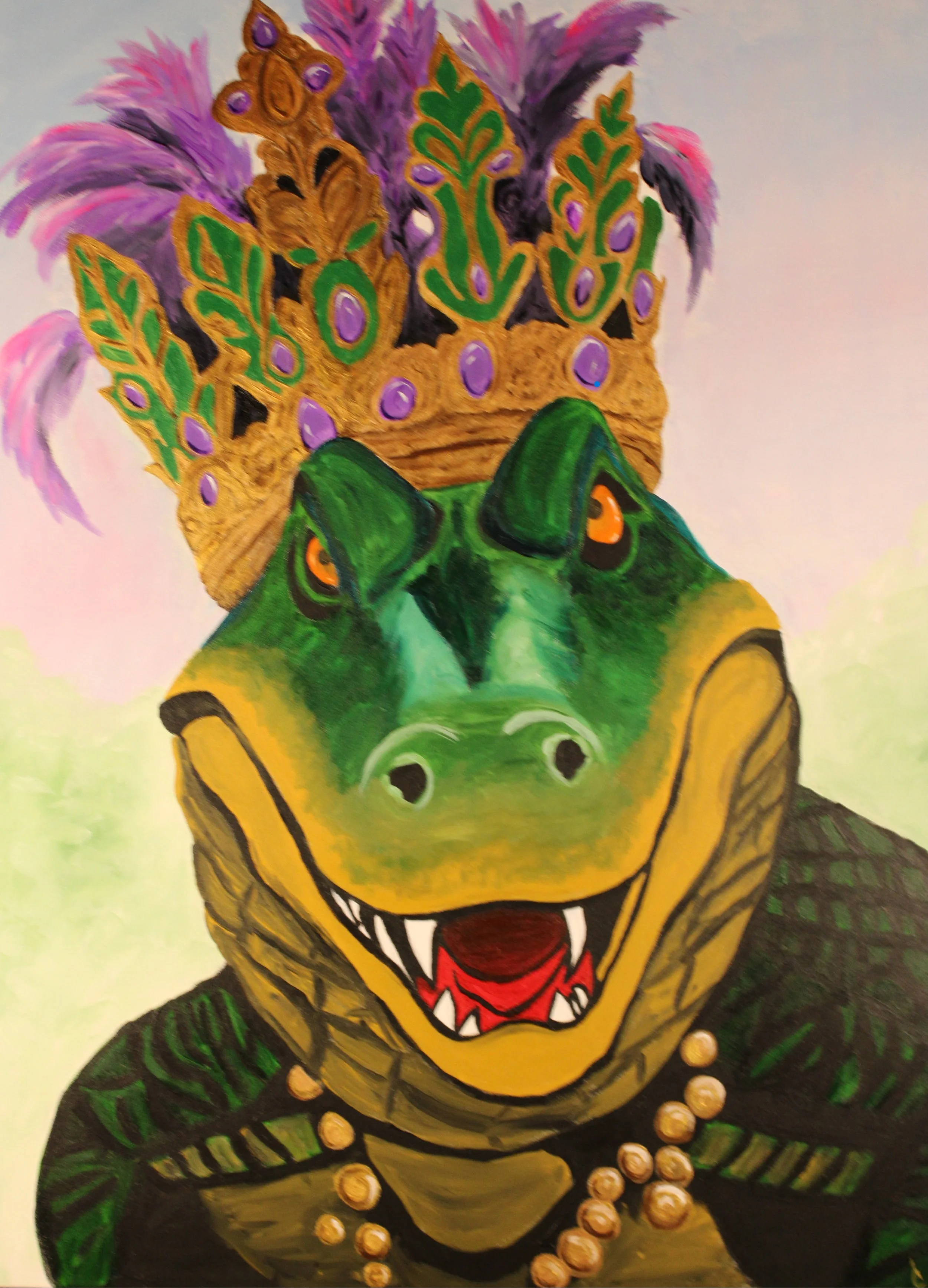 Original acrylic hand painting on professional unframed gallery wrapped canvas. Colorful abstract Louisiana alligator celebrating Mardi Gras with a crown and parade beads.