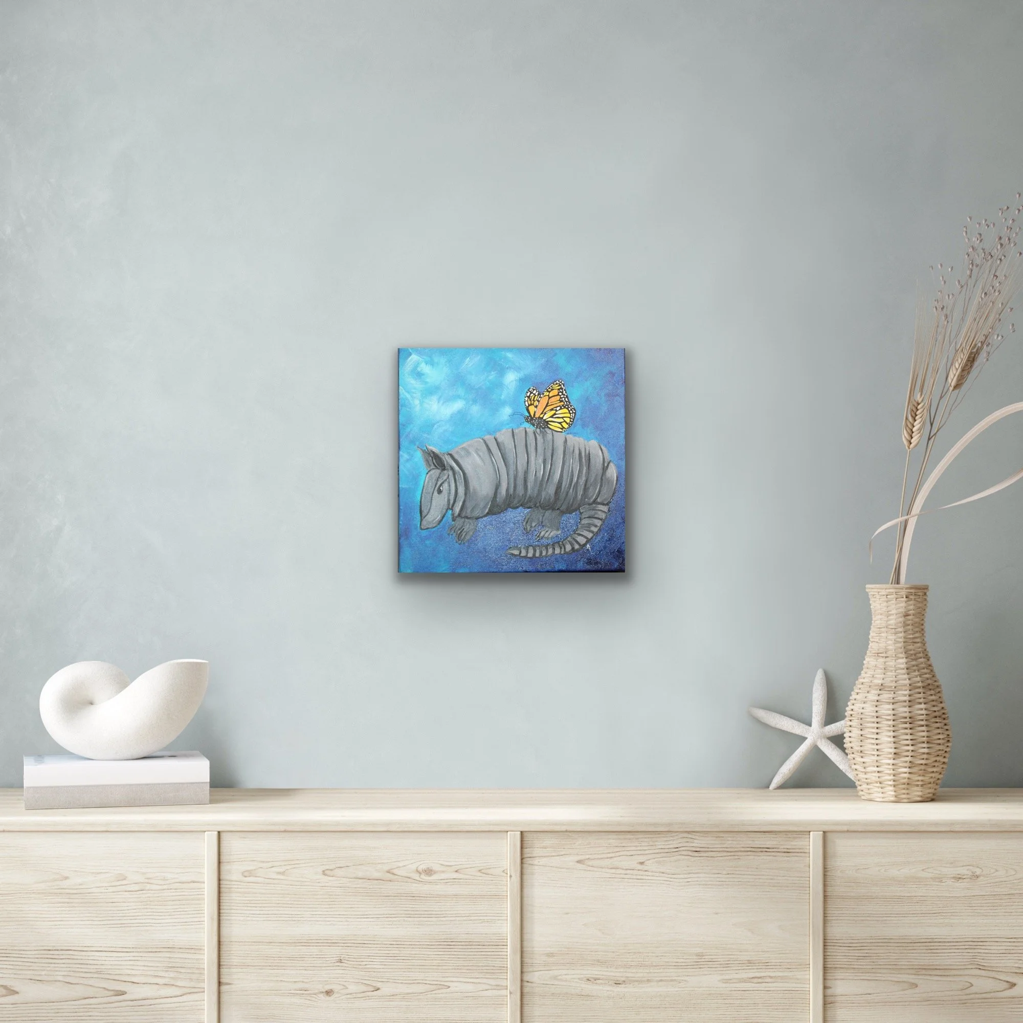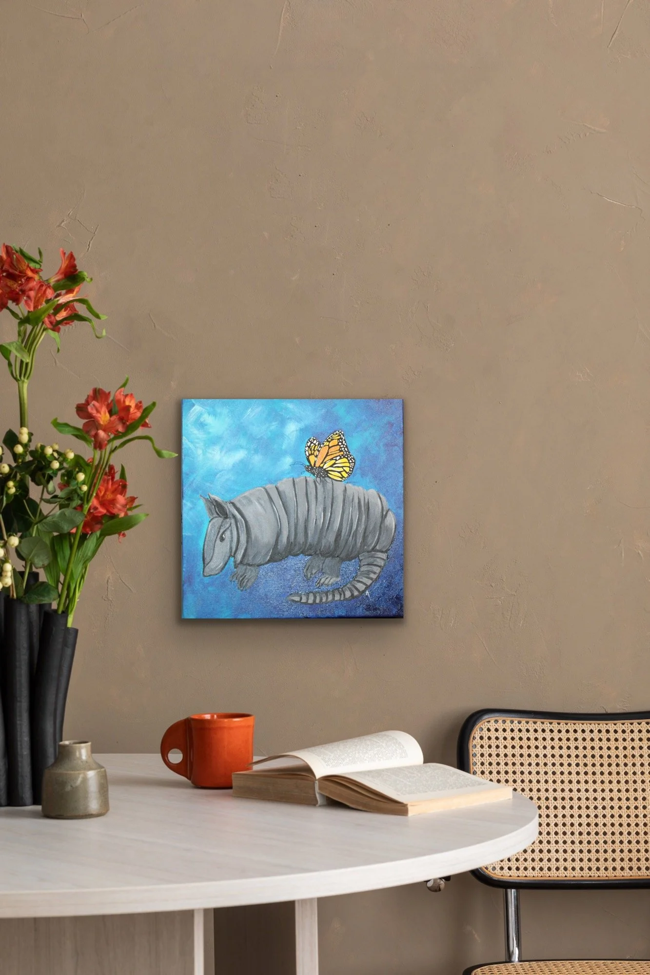 Professional gallery wrapped canvas featuring an acrylic hand painting of a happy Texas armadillo and his friend the monarch butterfly. This is a fun one! Not framed.