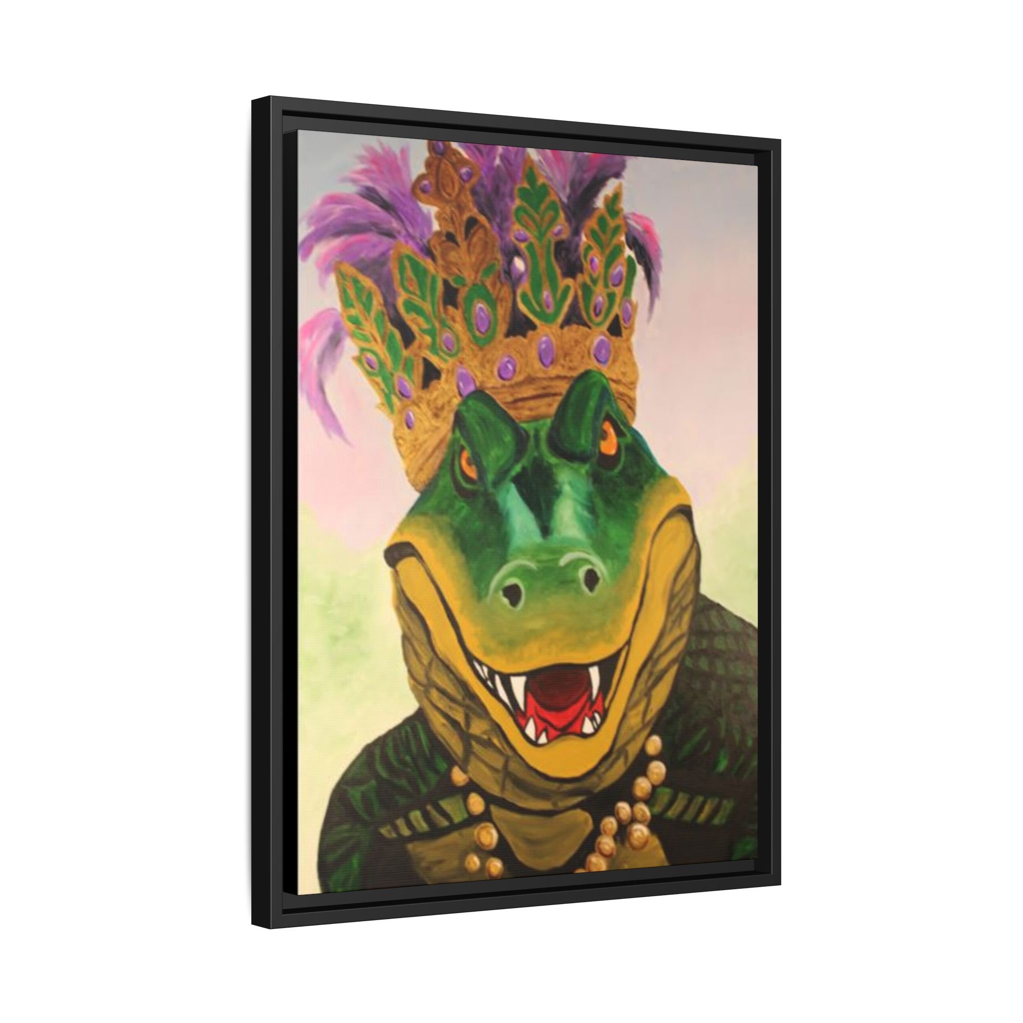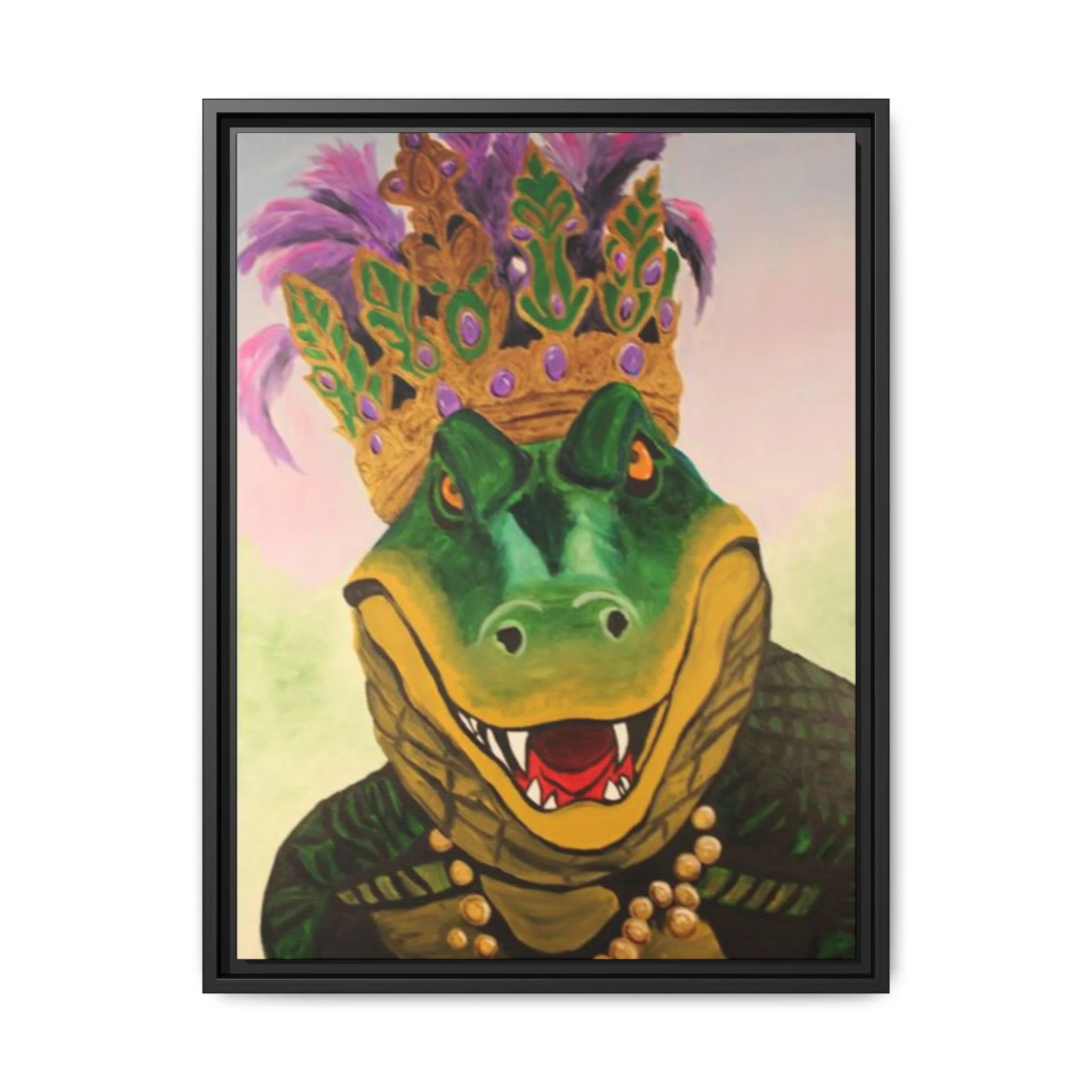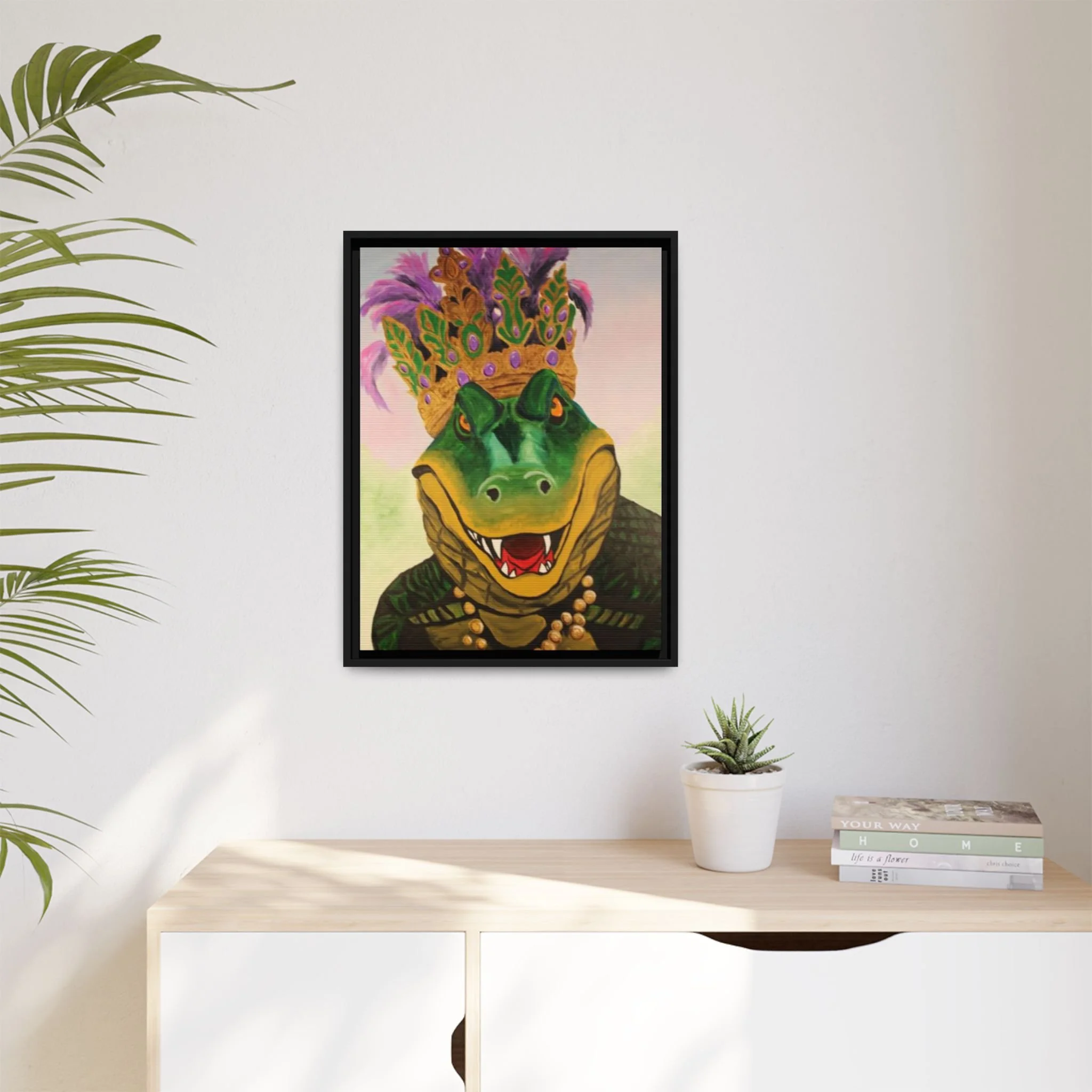 A vibrant matte canvas print framed in lightweight pine, this piece brings playful character and bold color to any wall. The artwork — a regal alligator wearing a jewel-toned crown and festive feathers — pops with rich, finely detailed inks on a cotton-poly canvas blend finished with a proprietary coating for crisp contrast. The slim framed profile and included sawtooth hanger make it easy to display vertically, horizontally, or square depending on size. Sustainably produced materials and non-toxic latex inks mean it fits a home that cares about quality and the planet, while the lively subject adds a touch of whimsical elegance to living rooms, studios, nurseries, or gallery walls.