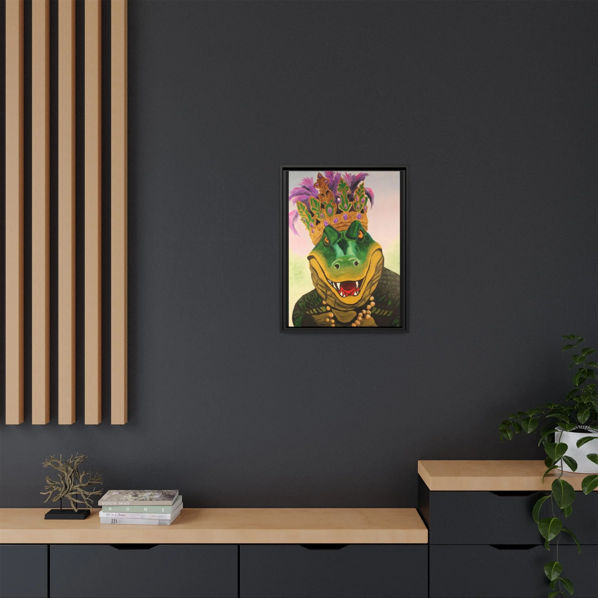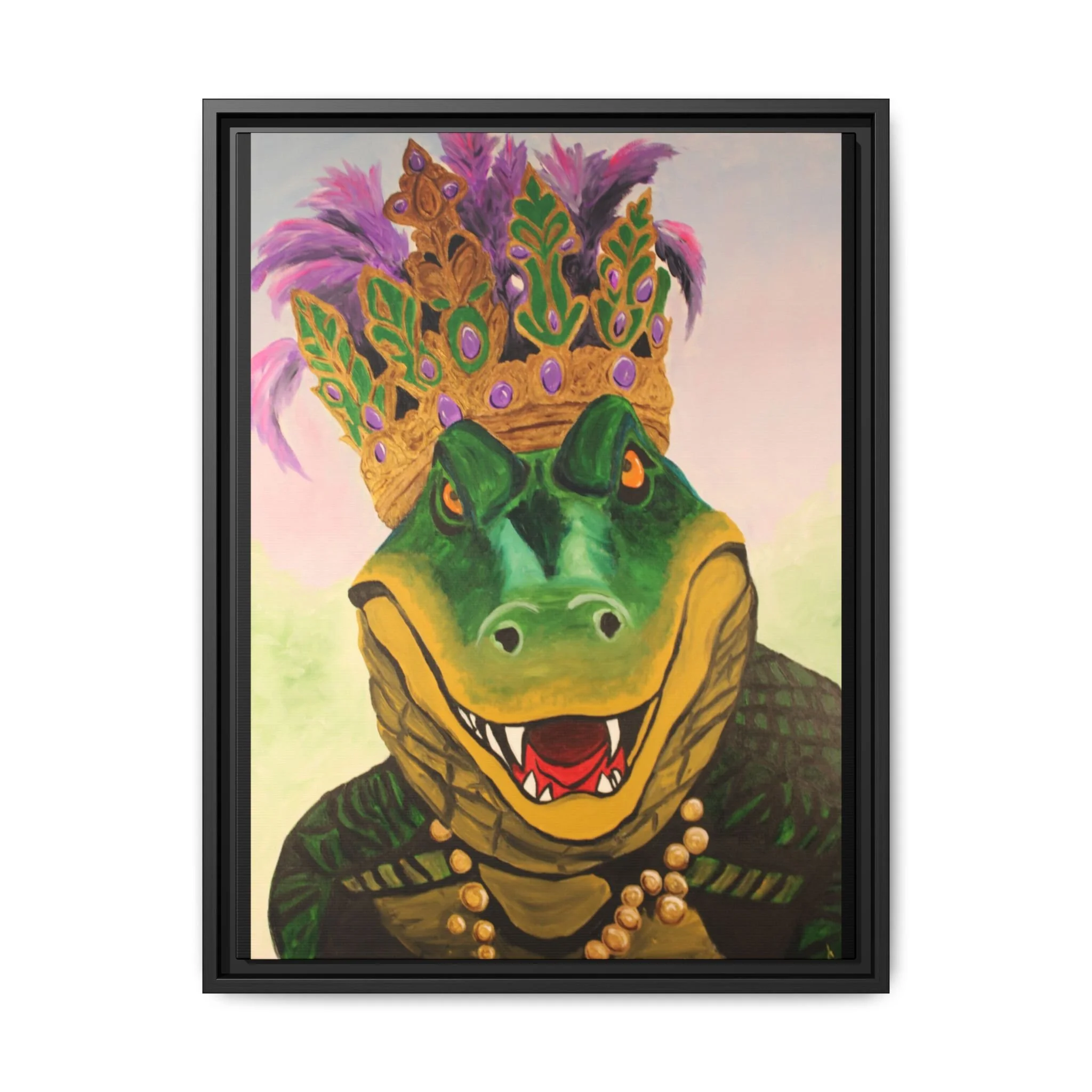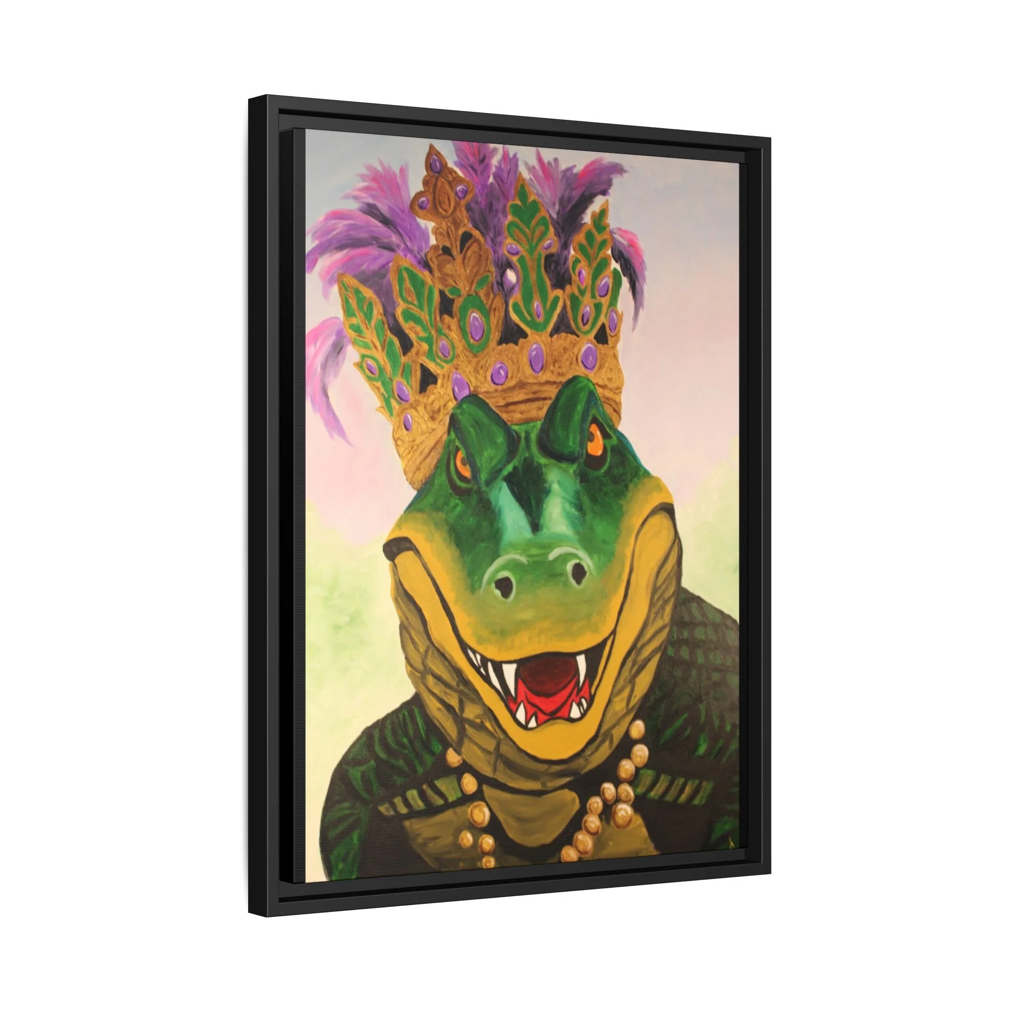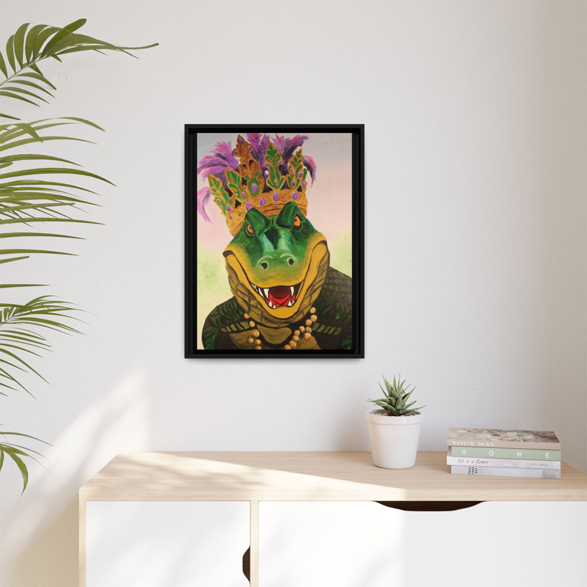 Bring bold charm and playful Southern flair to your wall with this matte canvas framed art. A regal alligator, adorned with a jeweled crown and purple feathers, grins with confident mischief — a piece that balances whimsy and handcrafted quality. The textured matte finish softens glare while preserving vivid, lifelike color, and the slim pine frame gives it a clean, gallery-ready presence. Hang it in a lively living room, an eclectic hallway, or a cozy den to spark conversation and add personality to everyday moments.