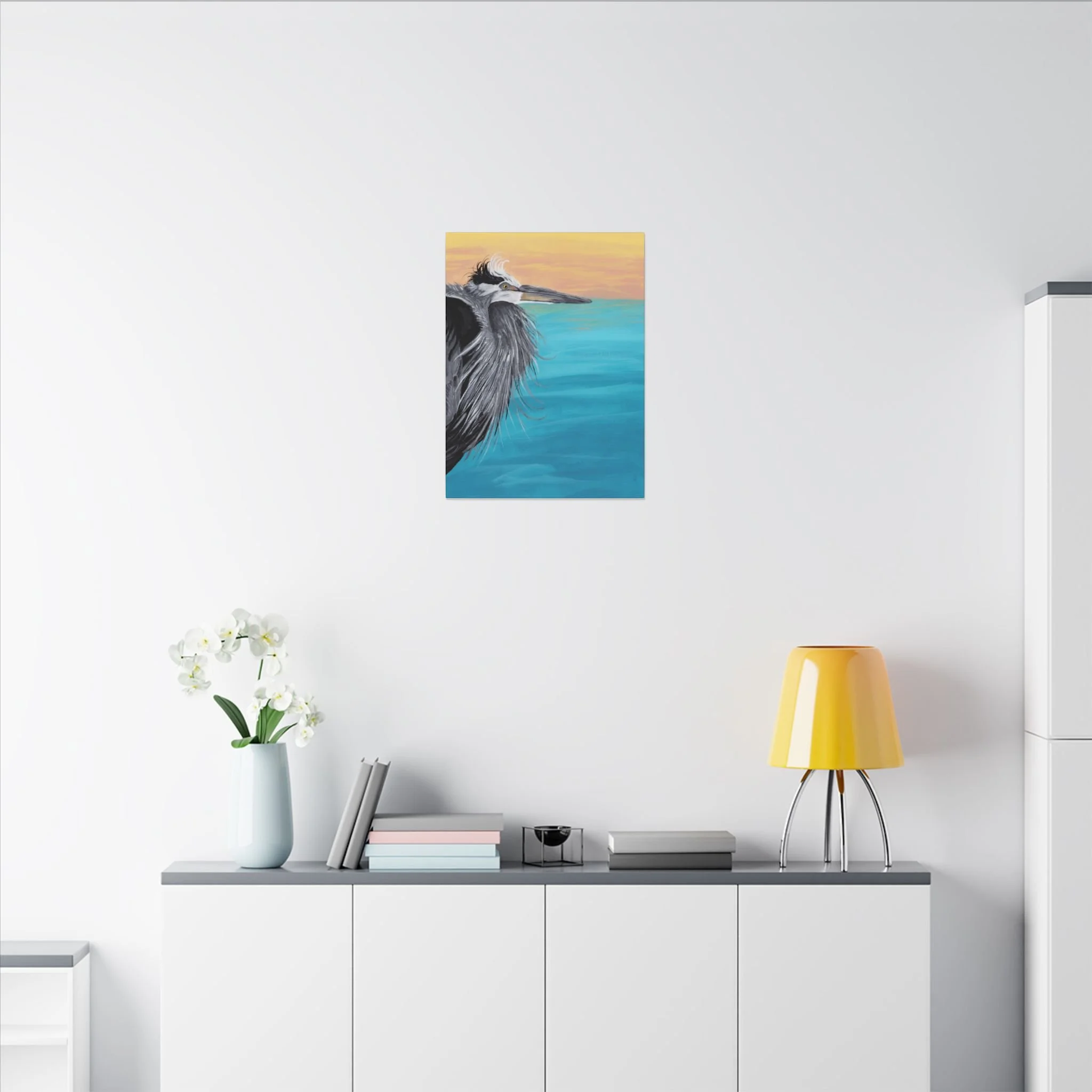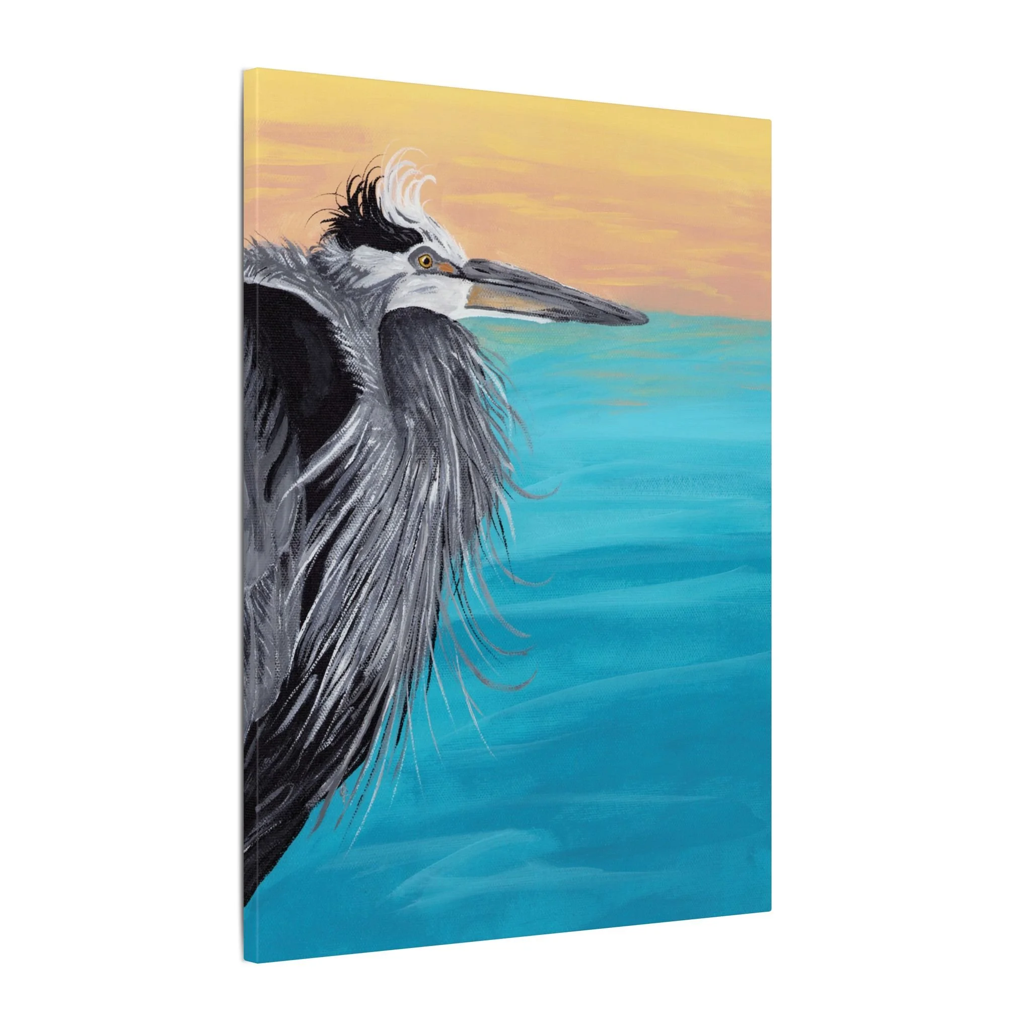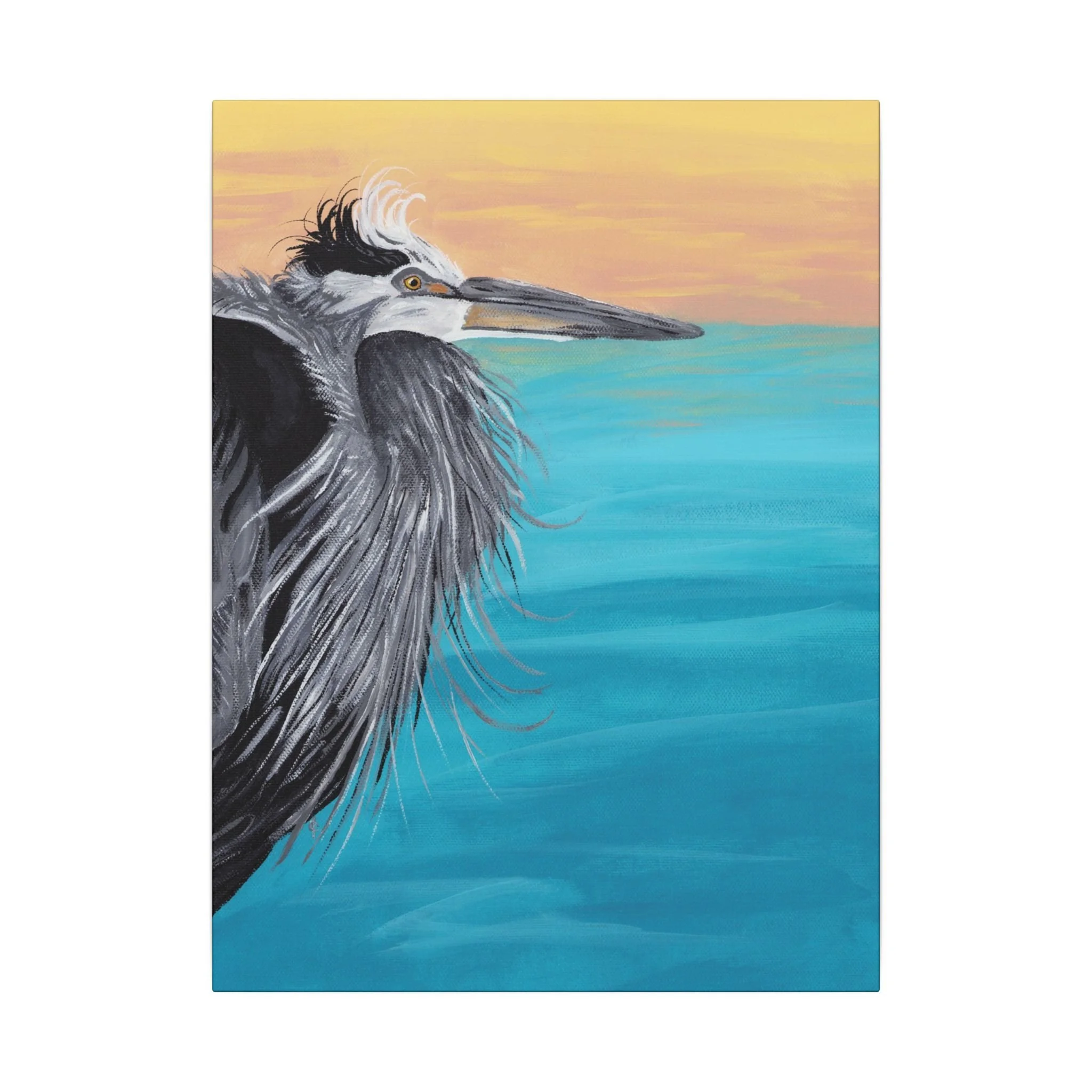 Salt-warmed air and the hush of early morning tides—this stretched matte canvas brings a coastal moment into your room. The painting captures a watchful great blue heron against a turquoise sea and a soft, sun-washed sky. Brushstrokes show the bird’s layered feathers in expressive detail, while the broad, calm water and warm horizon balance the composition. The matte finish softens glare and gives the colors a painterly, museum-quality presence on a low-profile 0.75" stretcher. It hangs quietly, steadied by rubber backing dots, and reads like a window to the shoreline whenever you need a breath of ocean calm.