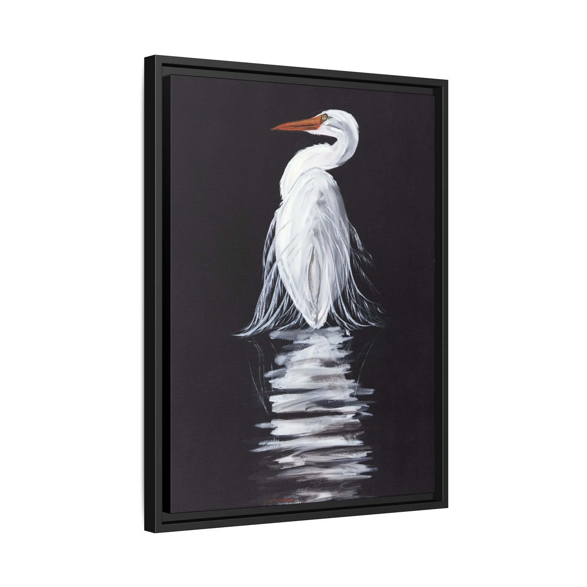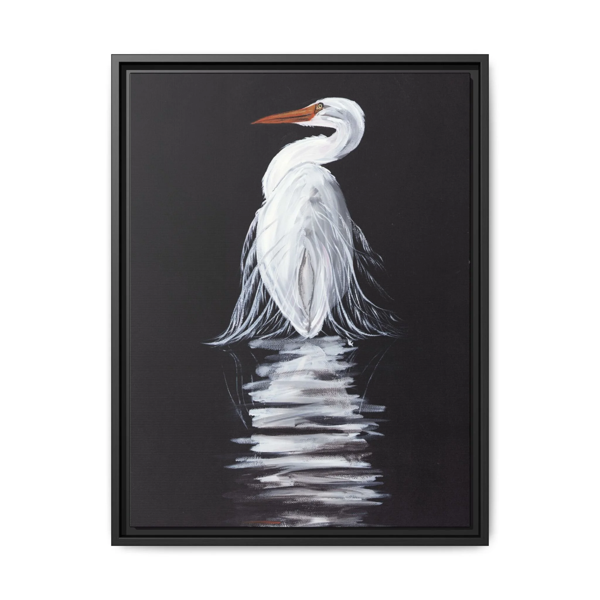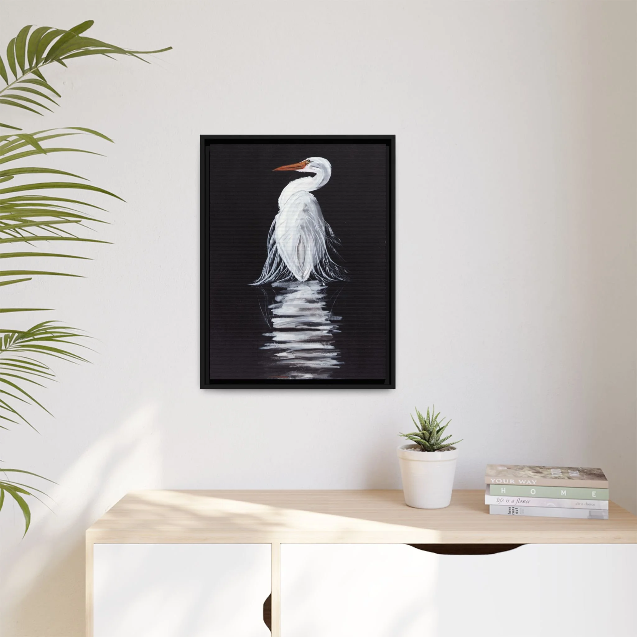 A serene matte canvas print that captures a solitary white heron reflected in still, dark waters. Brushed strokes and a limited palette create a calm, gallery-ready statement — framed in smooth pine with clean edges that let the image breathe. The subtle texture of the canvas and deep matte finish reduce glare and draw focus to the bird’s flowing plumage and whisper-soft reflections. Hang it in a quiet corner to bring coastal calm, or layer it with botanical and woven pieces for a collected, coastal-modern vignette.