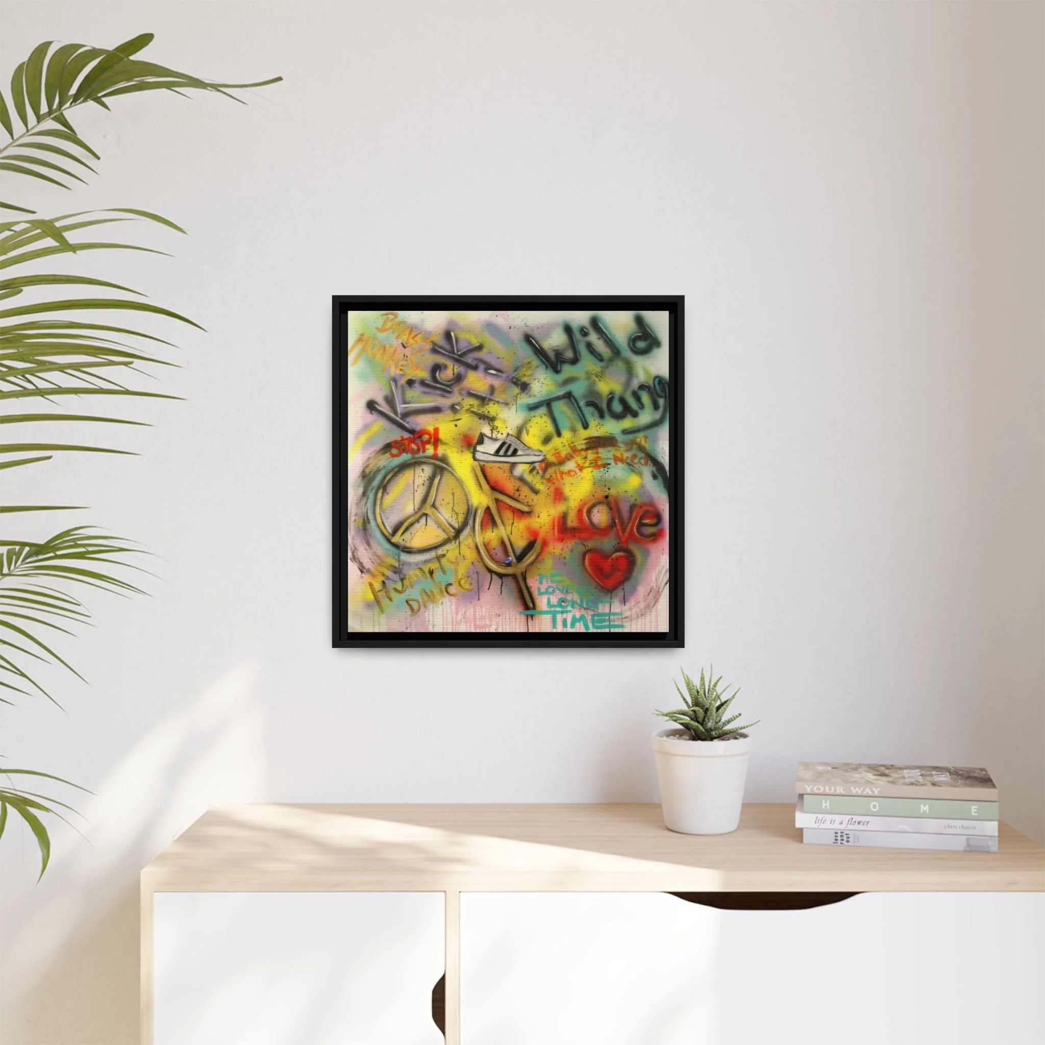 This framed matte canvas brings raw, urban energy into your space. Layers of spray-painted tags, symbols and splashes of color create a vibrant, lived-in wall piece that feels like a city alley captured in slow motion. The pine frame and muted matte finish let the artwork’s texture and neon accents breathe—not loud, but impossible to ignore. Hang it where conversation starts: a living room wall, a creative studio, or an entry that sets the tone for the whole home. It invites movement, memory, and a little rebellion into everyday moments.