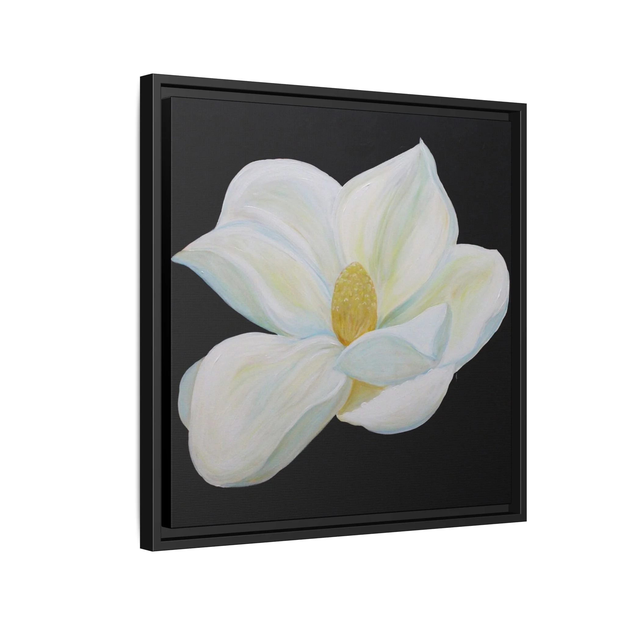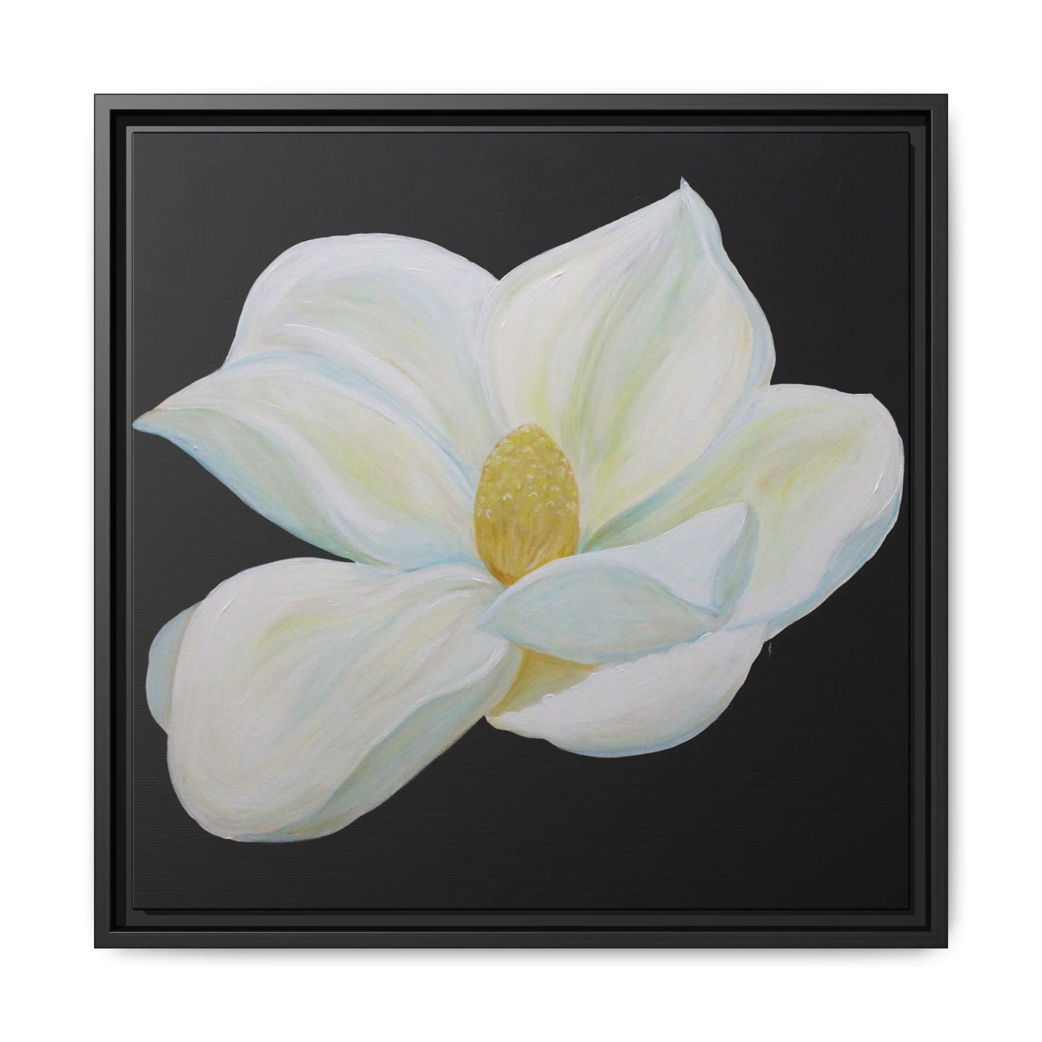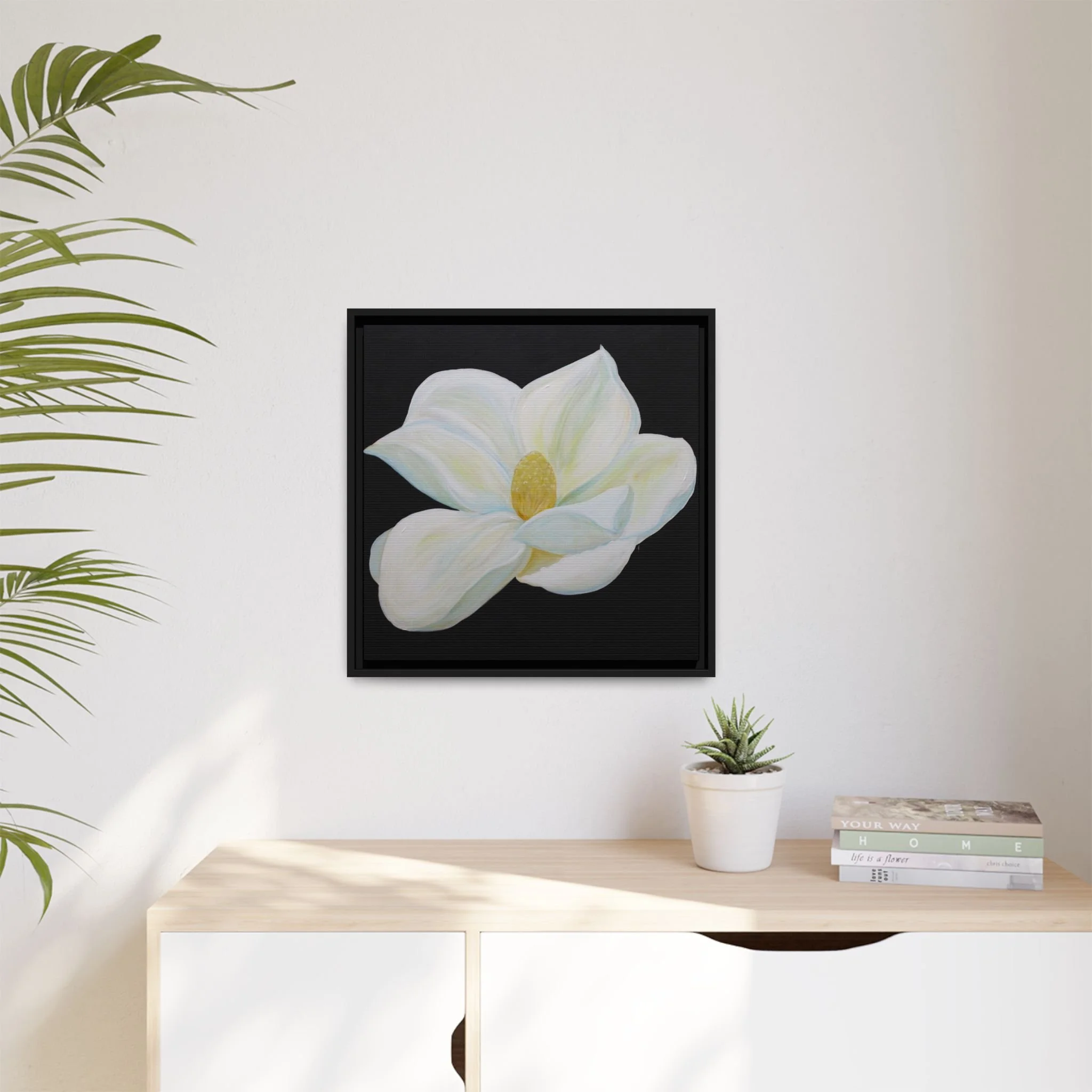 A framed matte canvas print that brings calm and elegance to any room. Soft brushstrokes form a single large magnolia blossom against a deep, velvety background, letting the delicate whites and pale pastels breathe. The slim pine frame in a multi-color finish adds a refined edge while keeping the composition light and modern. Hang it above a console, beside a reading nook, or in a bedroom to introduce a quiet, botanical presence that feels both fresh and timeless.