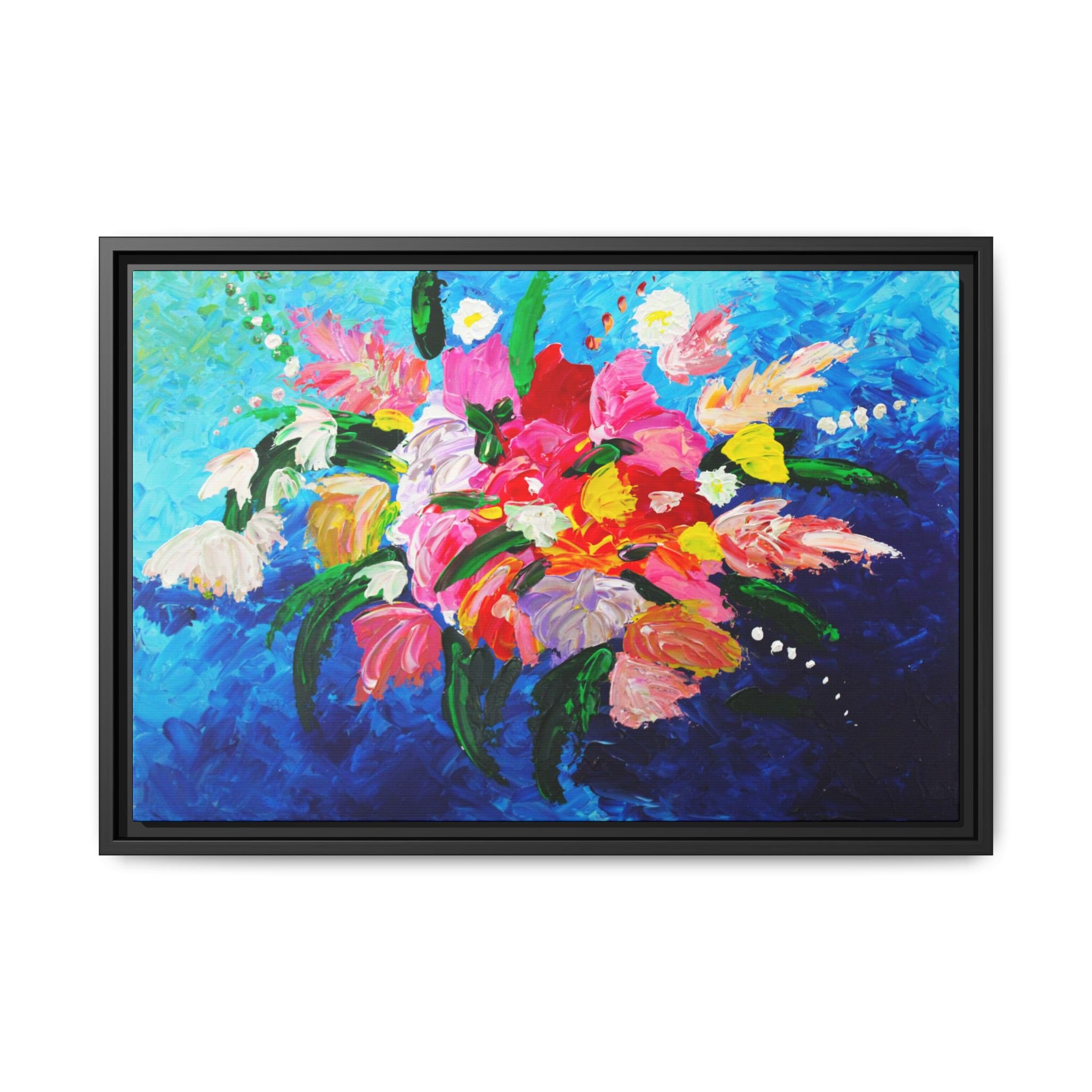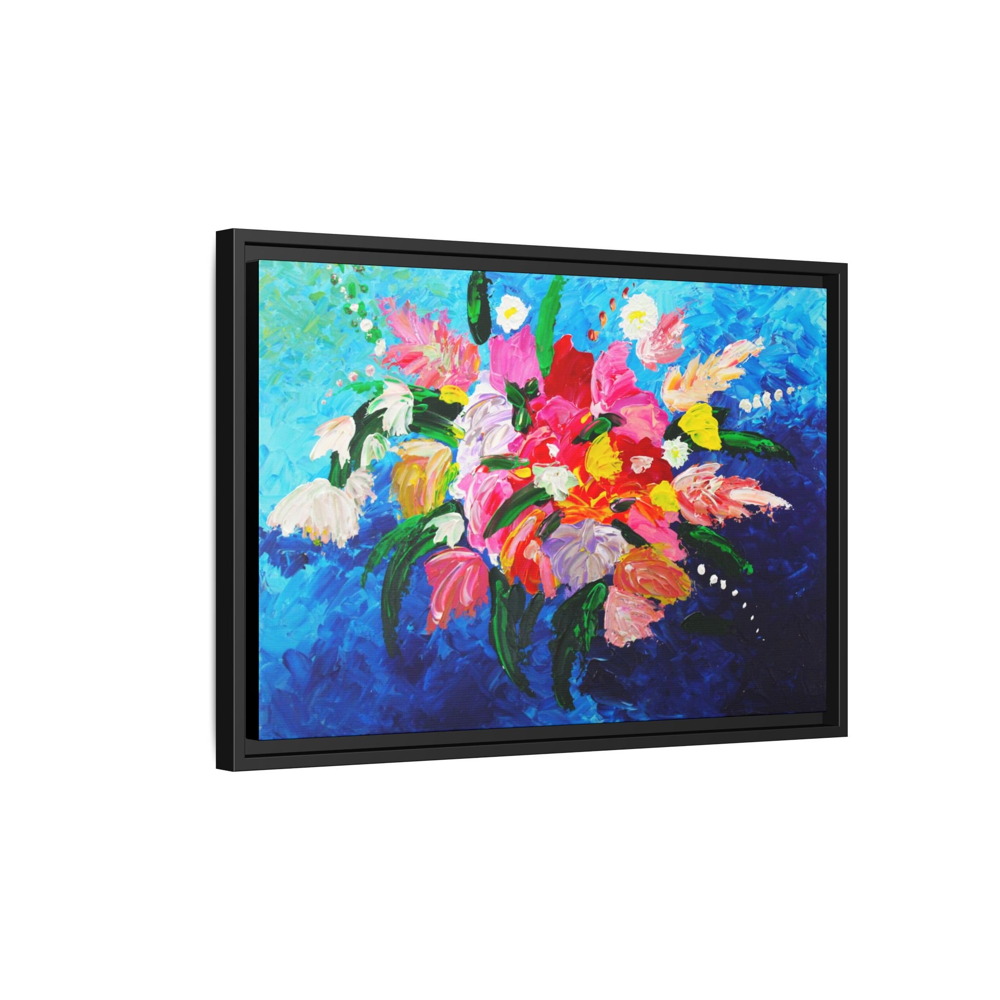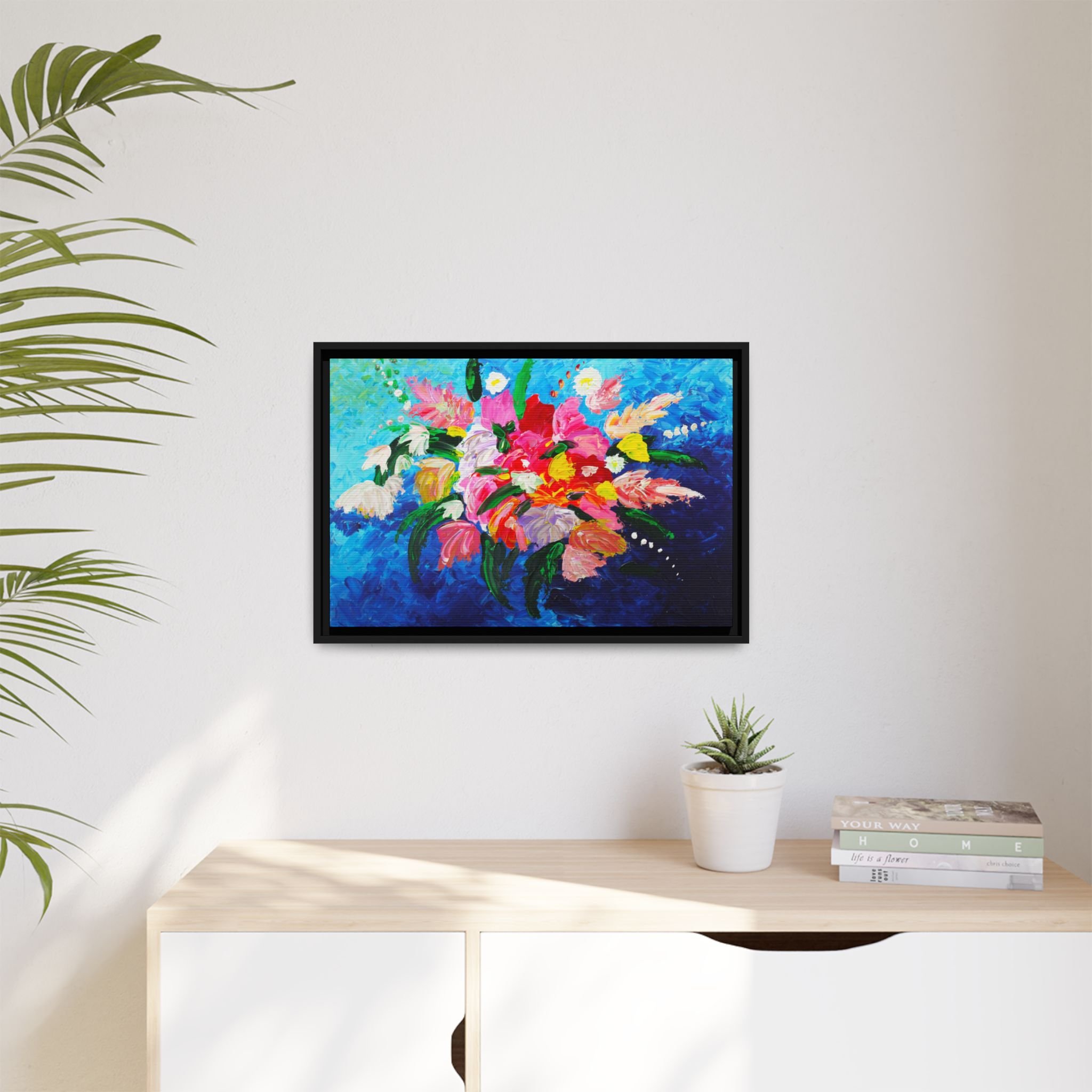 This framed matte canvas brings expressive, painterly florals into any room with bold color and textured depth. The bouquet bursts from a vivid blue background — magentas, corals, and leafy greens that feel hand-brushed and alive. Mounted on a slim pine frame with a satin-black finish, the print reads like original artwork while staying lightweight and ready to hang. It settles into living rooms, entryways, or studio spaces where color and movement are wanted: a cheerful anchor on a gallery wall or a single statement over a console. The sustainably sourced materials and Greenguard Gold-certified, latex-based inks ensure clean, vibrant tones that hold up over time.
