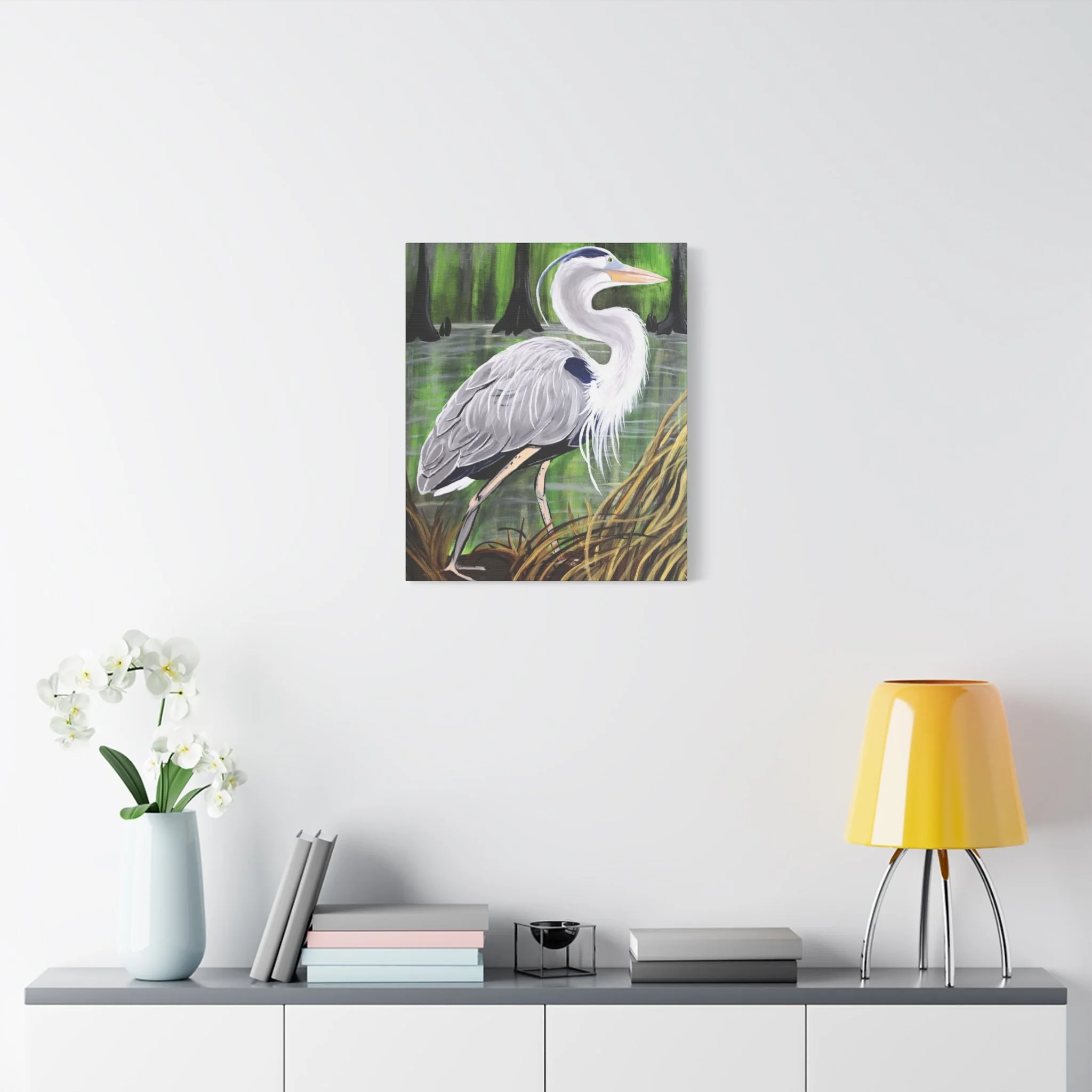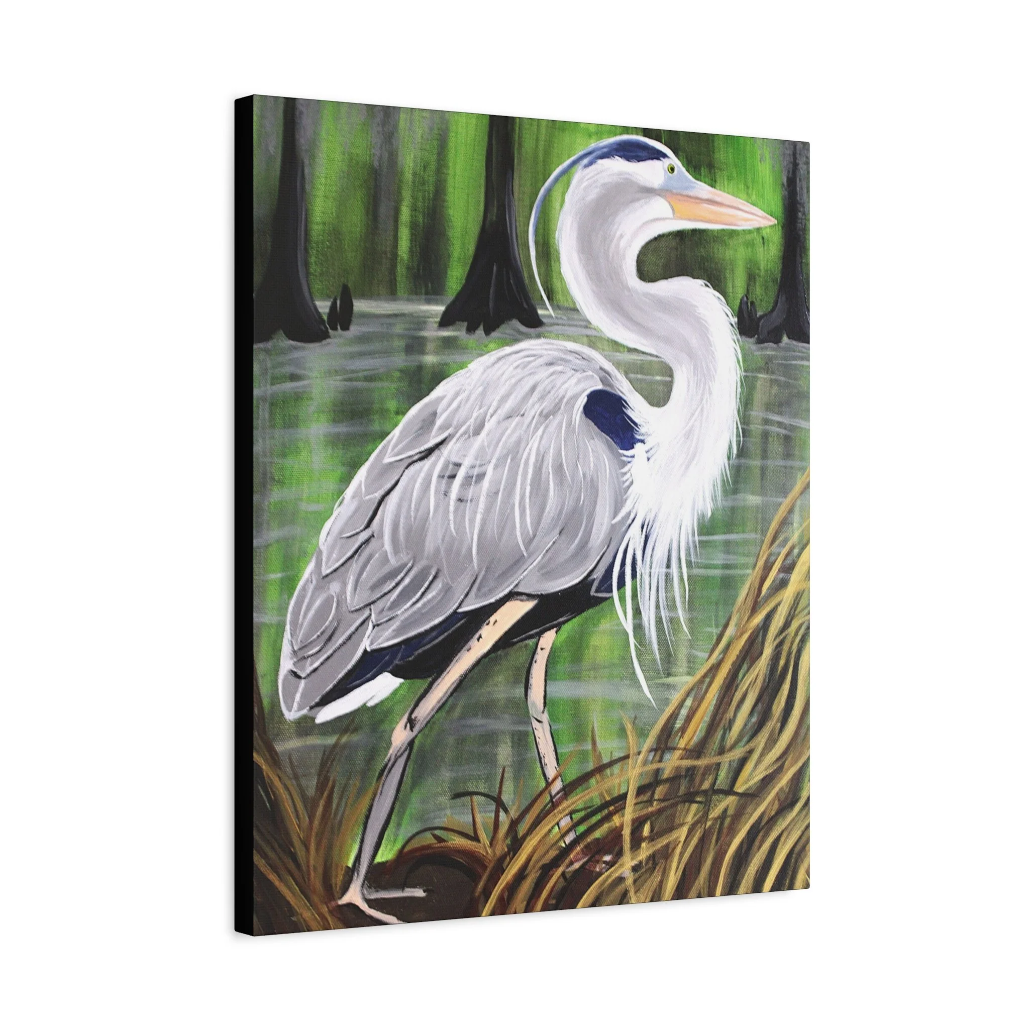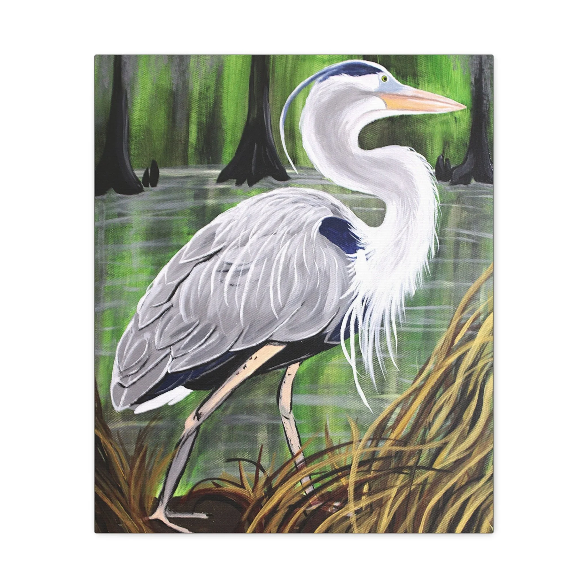 A matte stretched canvas that brings a quiet wetland moment into your home. The hand-painted heron stands still among cypress knees and marsh grasses, rendered in soft grays, muted greens, and warm neutrals. The matte finish keeps glare low and deepens the painted texture, while the 1.25" gallery-style depth gives the image presence on the wall without overpowering a room. Lightweight but sturdy, it fits into cozy reading nooks, sunlit entryways, or above a mantel where nature and calm are welcome. It feels like a slow morning by the swamp—breathy, observant, and steady—so the room settles around it.