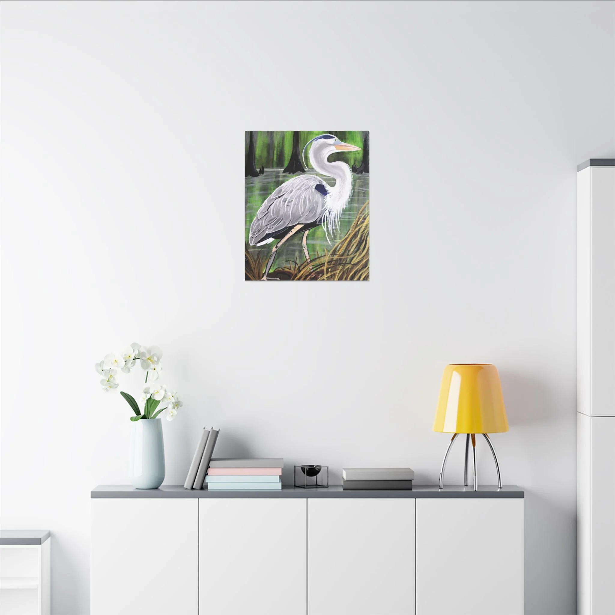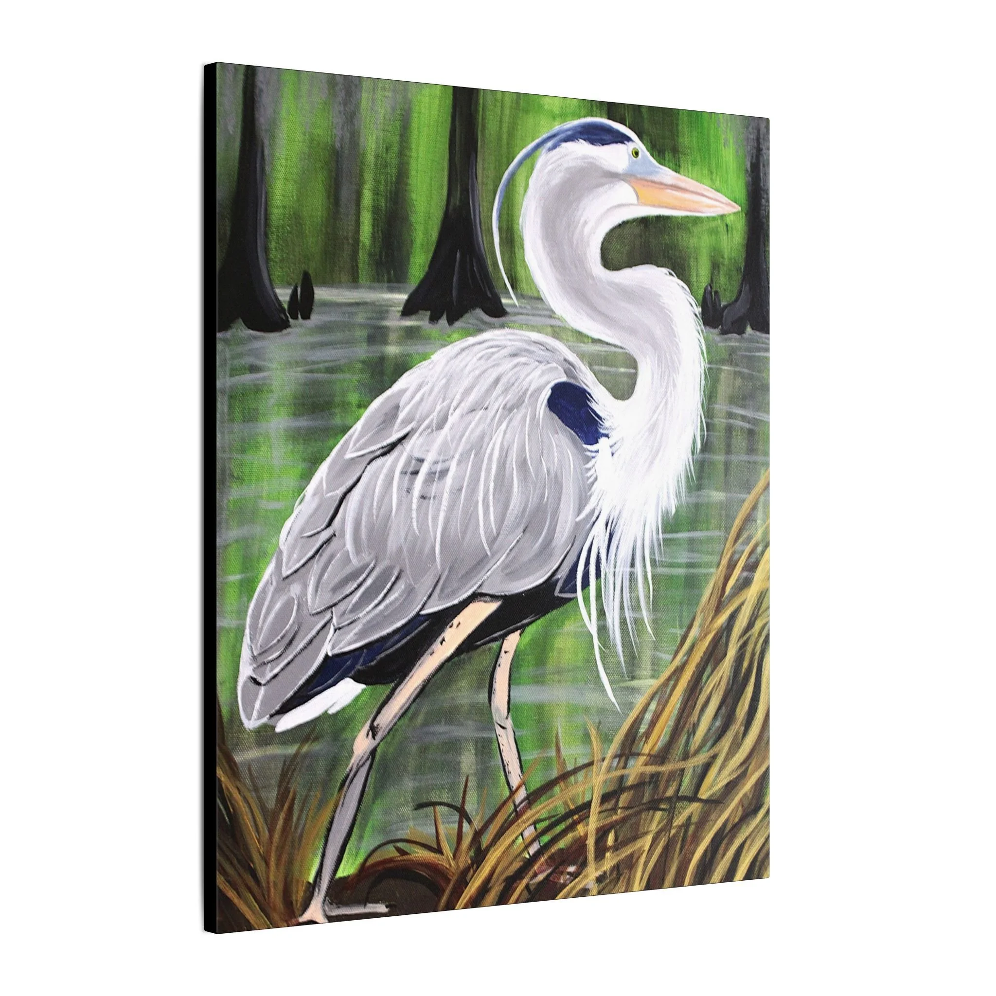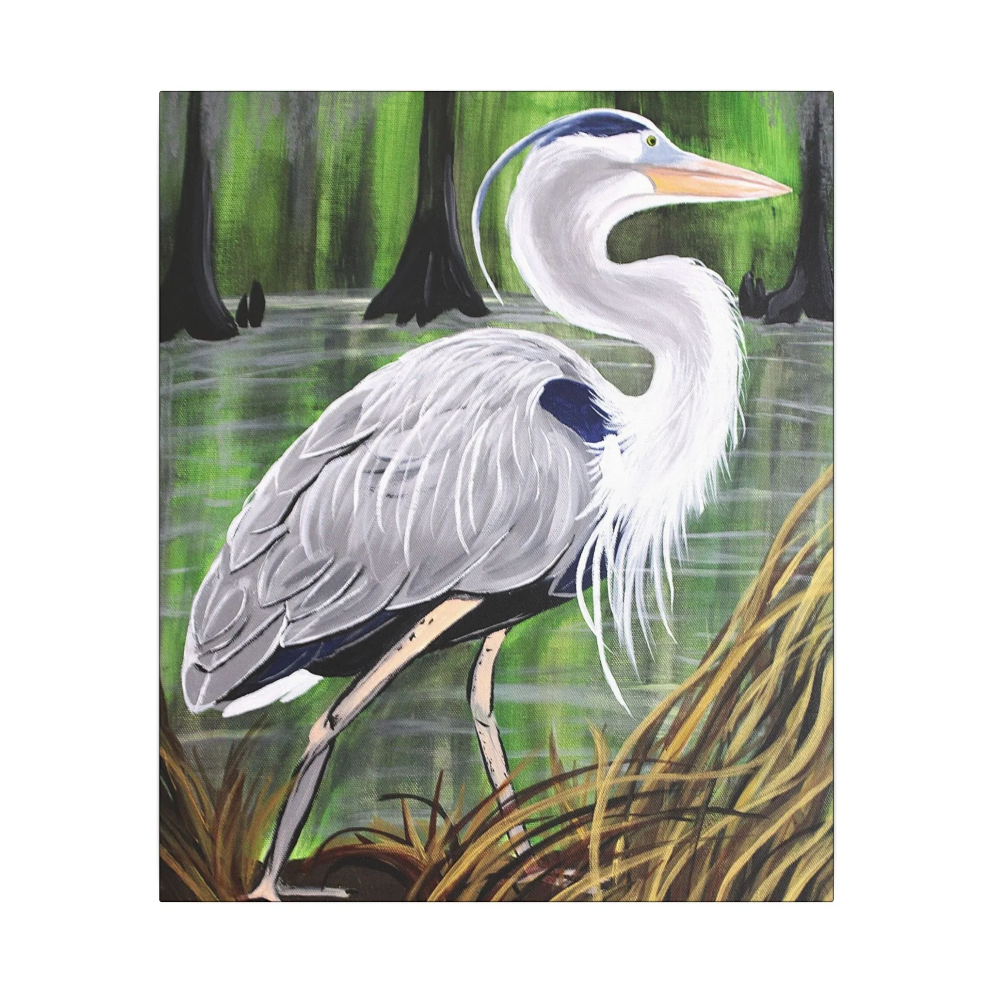 A stretched matte canvas print that brings a quiet swampland moment into your home. Painted in soft, natural tones, the heron stands tall among reeds and cypress knees, its feather detail rendered with delicate brushwork and a muted, atmospheric background. The 0.75" deep edge gives a gallery-ready presence on the wall while the matte finish keeps reflections low and colors feeling organic and true. This piece slips easily into nature-themed living rooms, coastal cottages, or anyone’s nook that craves a contemplative, outdoorsy touch — the kind of artwork that invites a slow breath and a longer look.