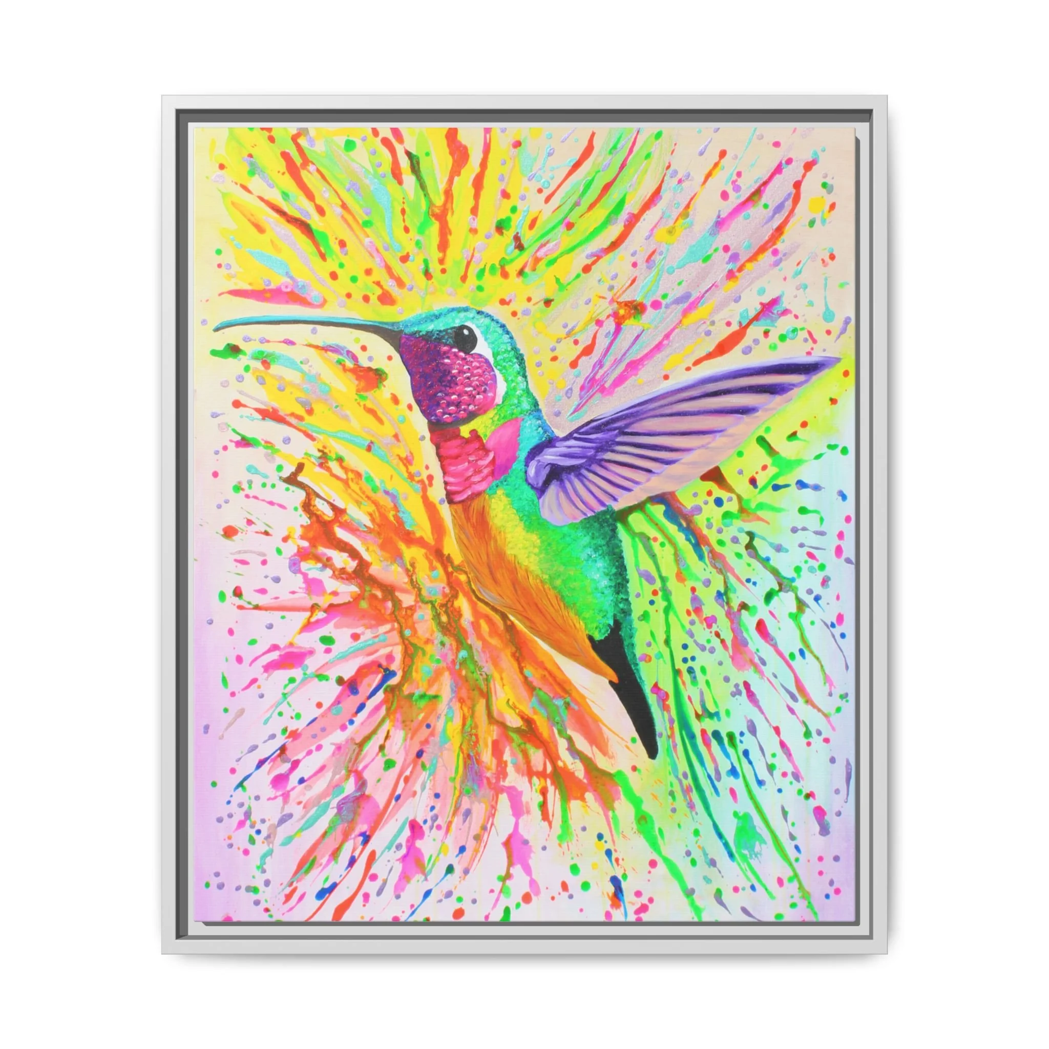 A framed matte canvas print that bursts with color and movement — a vibrant hummingbird rendered in acrylic