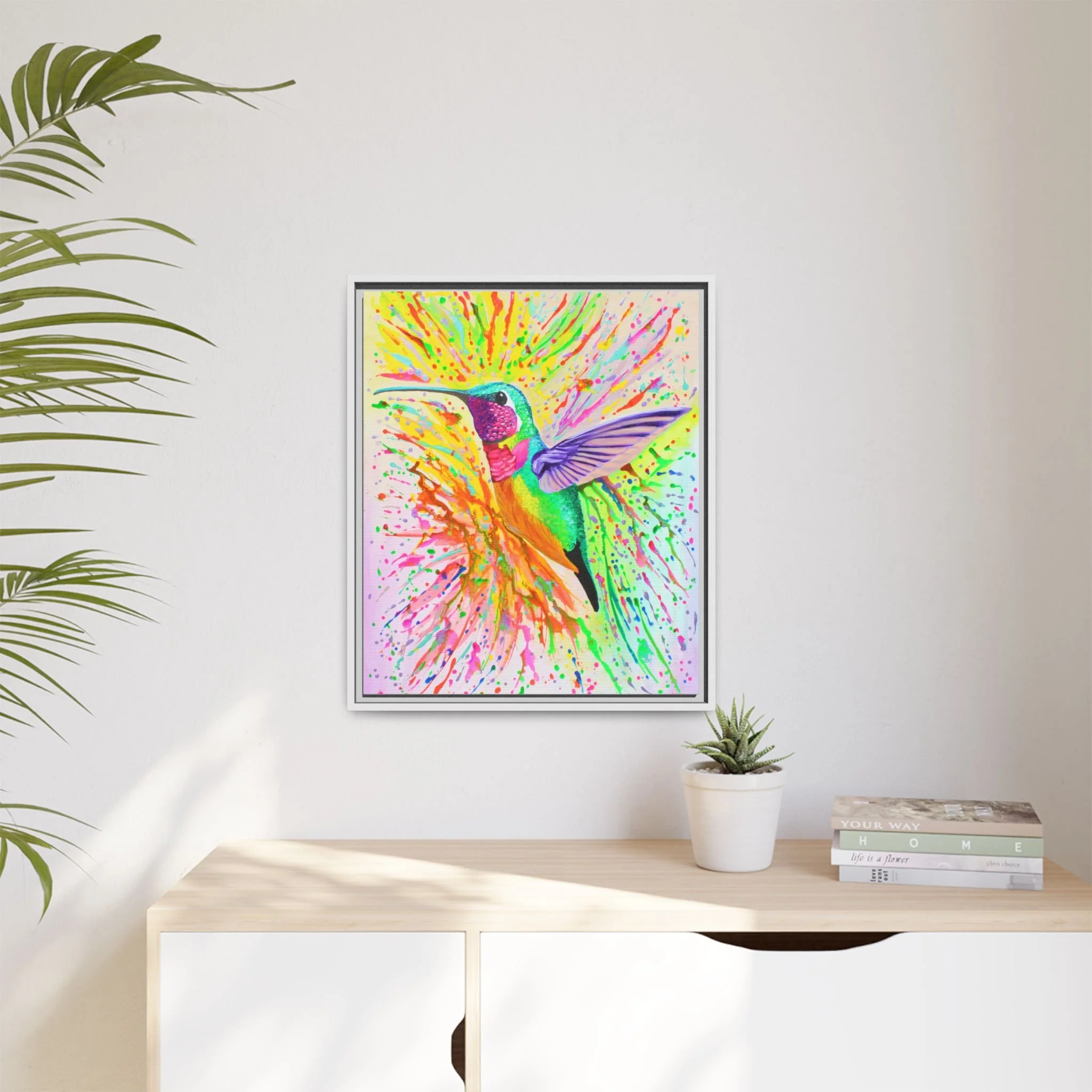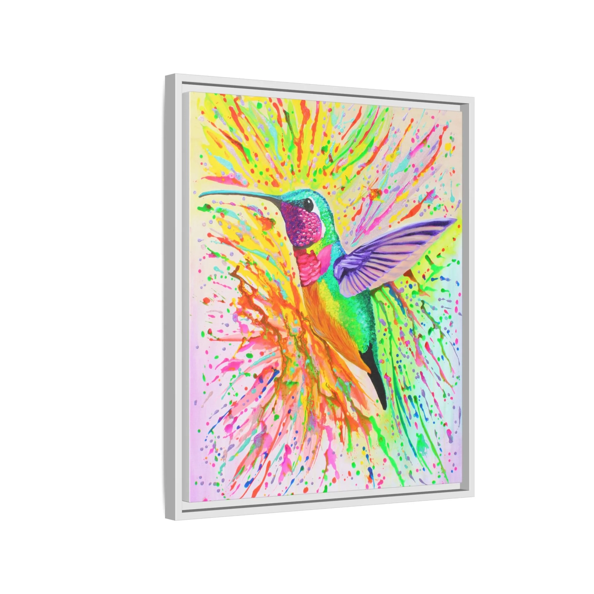 splashes and neon hues. The image feels alive: wings mid-beat, paint droplets fanning outward like a joyful exhale. Lightweight pine framing and a refined matte finish let the artwork sit confidently on a wall without glare, while richly saturated inks keep every delicate feather and paint spatter crisp. This piece brings an energetic, uplifting presence to entryways, sunlit reading nooks, or creative studios, inviting a sense of wonder and motion wherever it hangs.