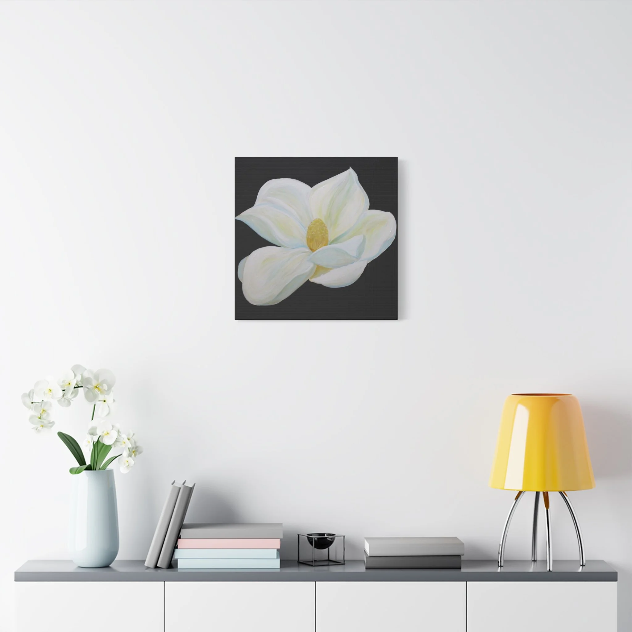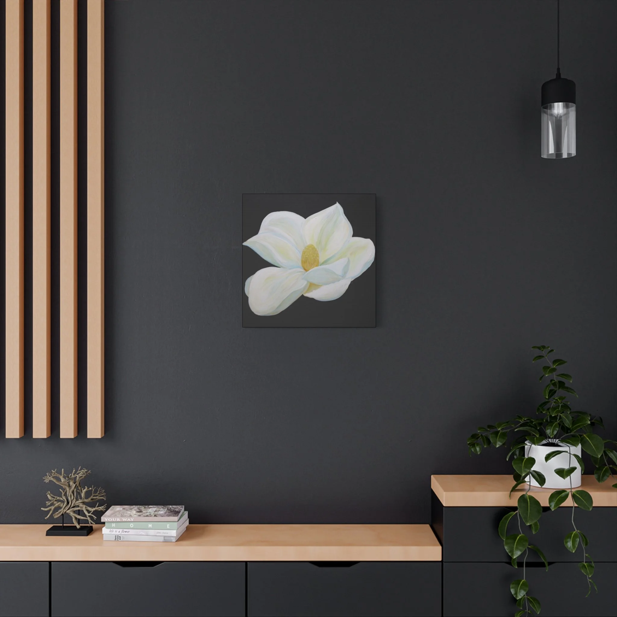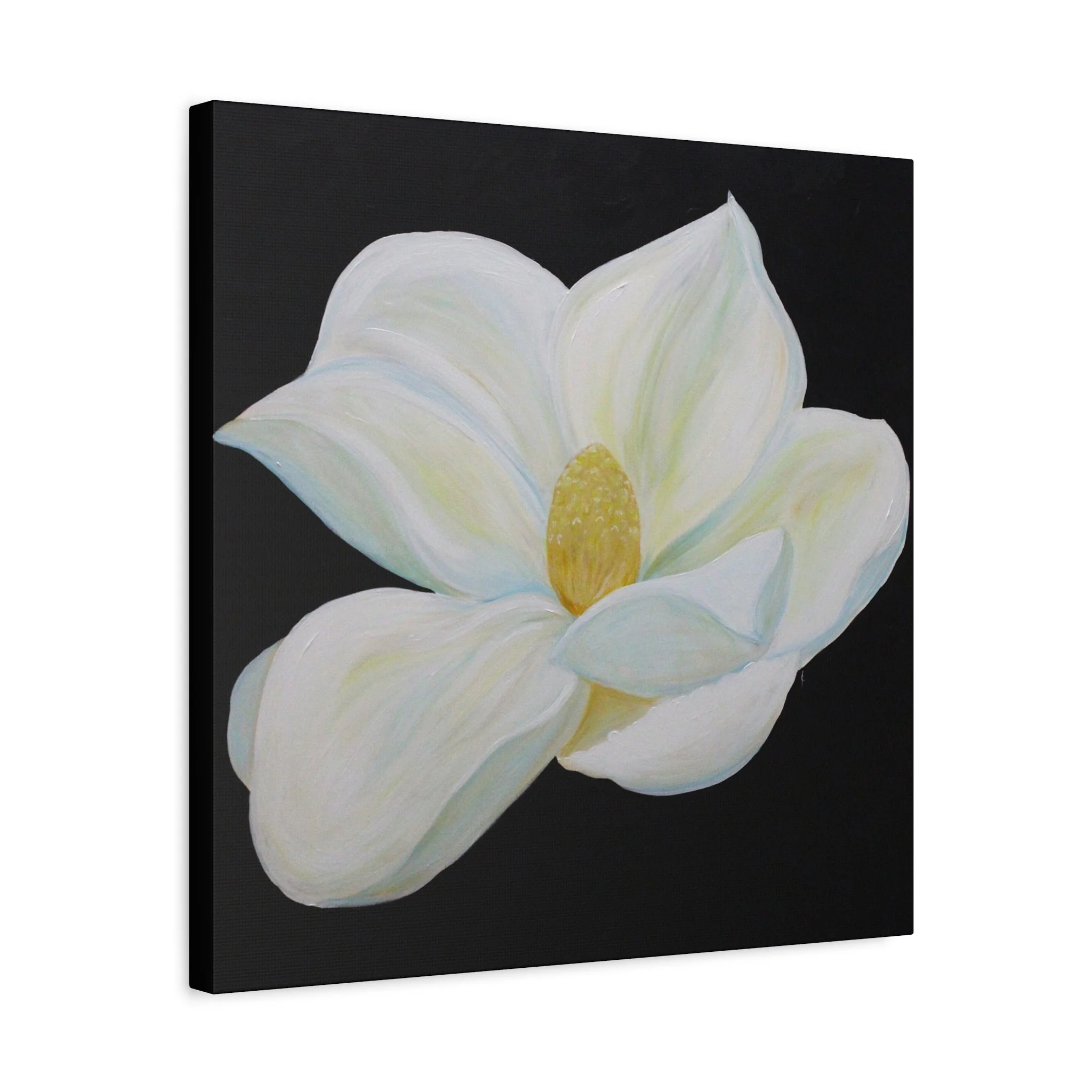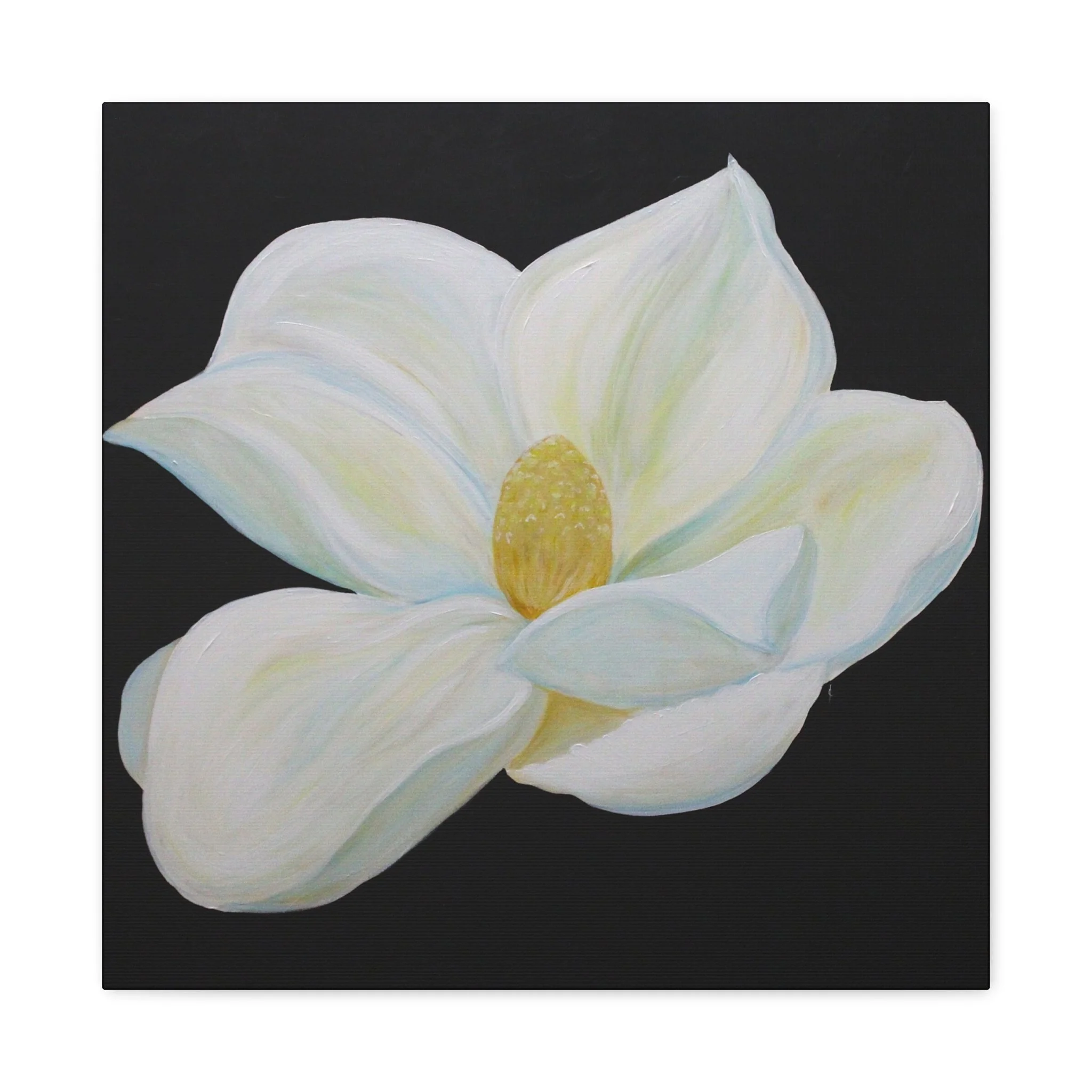 A serene, gallery-ready stretched canvas that puts a single magnolia blossom front and center. The matte surface softens glare and deepens the inky black background so the flower’s creamy whites and pale greens glow with quiet presence. Hung over a bedside, tucked into a cozy reading nook, or leaned on a mantel, this canvas brings a calm, elegant pause to everyday spaces. The subtle texture of the cotton-poly composite and the finely detailed printing preserve brushwork and tonal nuance, so the piece feels like an original painting rather than a flat print.