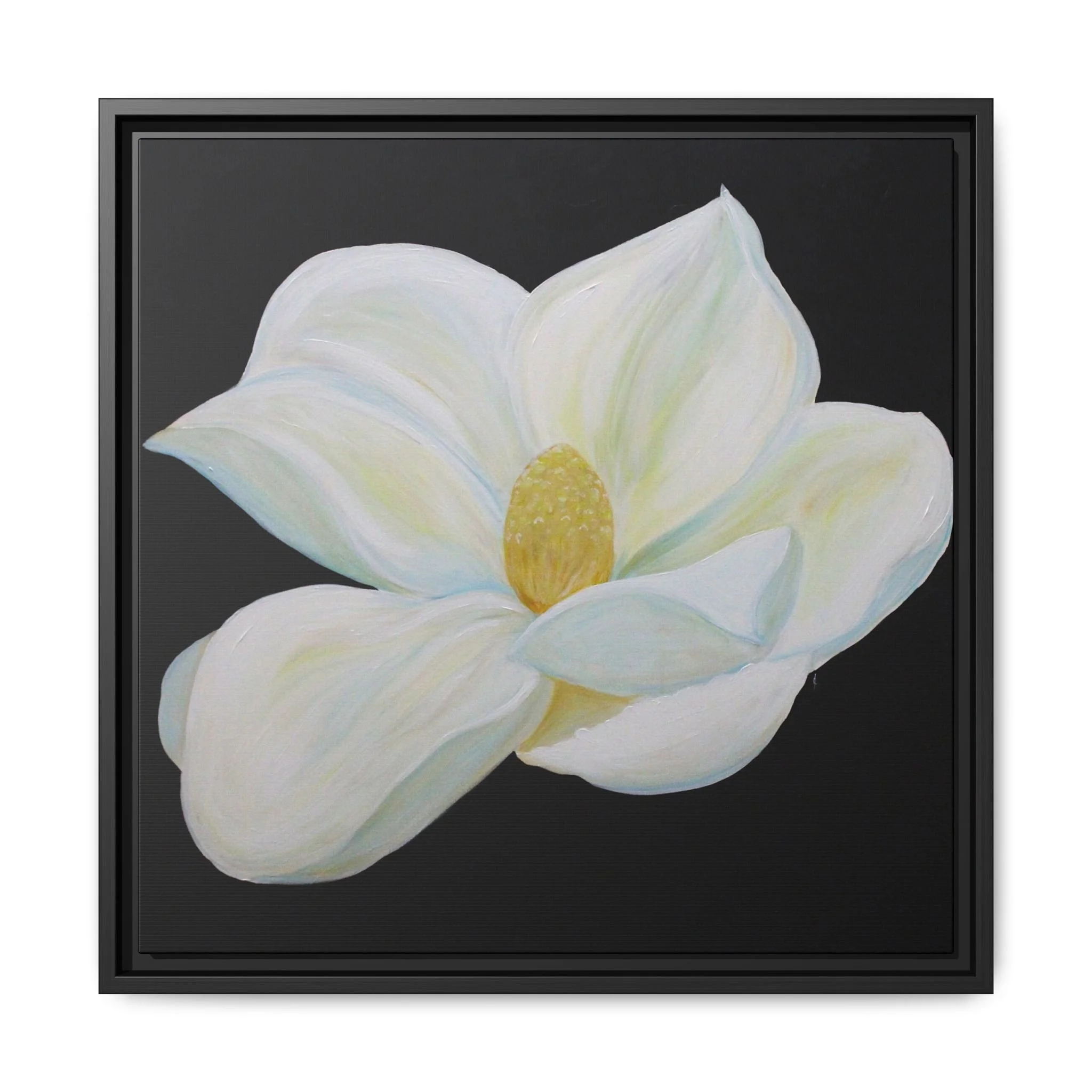 A serene matte canvas print capturing a single pale magnolia bloom against a deep black field. The soft, painterly petals glow with subtle creams and pale greens, offering a quiet focal point that calms and uplifts a room. Mounted in a slim pine frame finished in deep black, the piece reads like a modern heirloom—understated, elegant, and tactile. It settles naturally above a bedside table, in a minimalist living room, or in a sunlit hallway, bringing a moment of botanical stillness to everyday life.