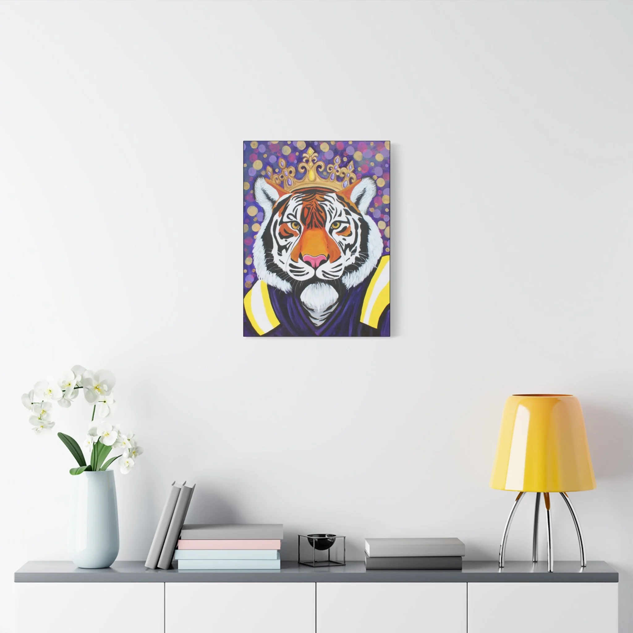 Bold, crowned, and impossibly present — this stretched matte canvas brings a regal tiger into the room with painterly color and confident brushwork. The rich purples and golds frame the tiger’s amber gaze, while the matte finish keeps glare low and the textures soft to the eye. Hung above a reading nook or at the head of a gallery wall, this piece becomes a statement of character: warm, a little wild, and quietly luxurious. It reads like a portrait passed down from an imagined monarch — playful yet dignified — and fits homes where art is conversation and color is courage.
