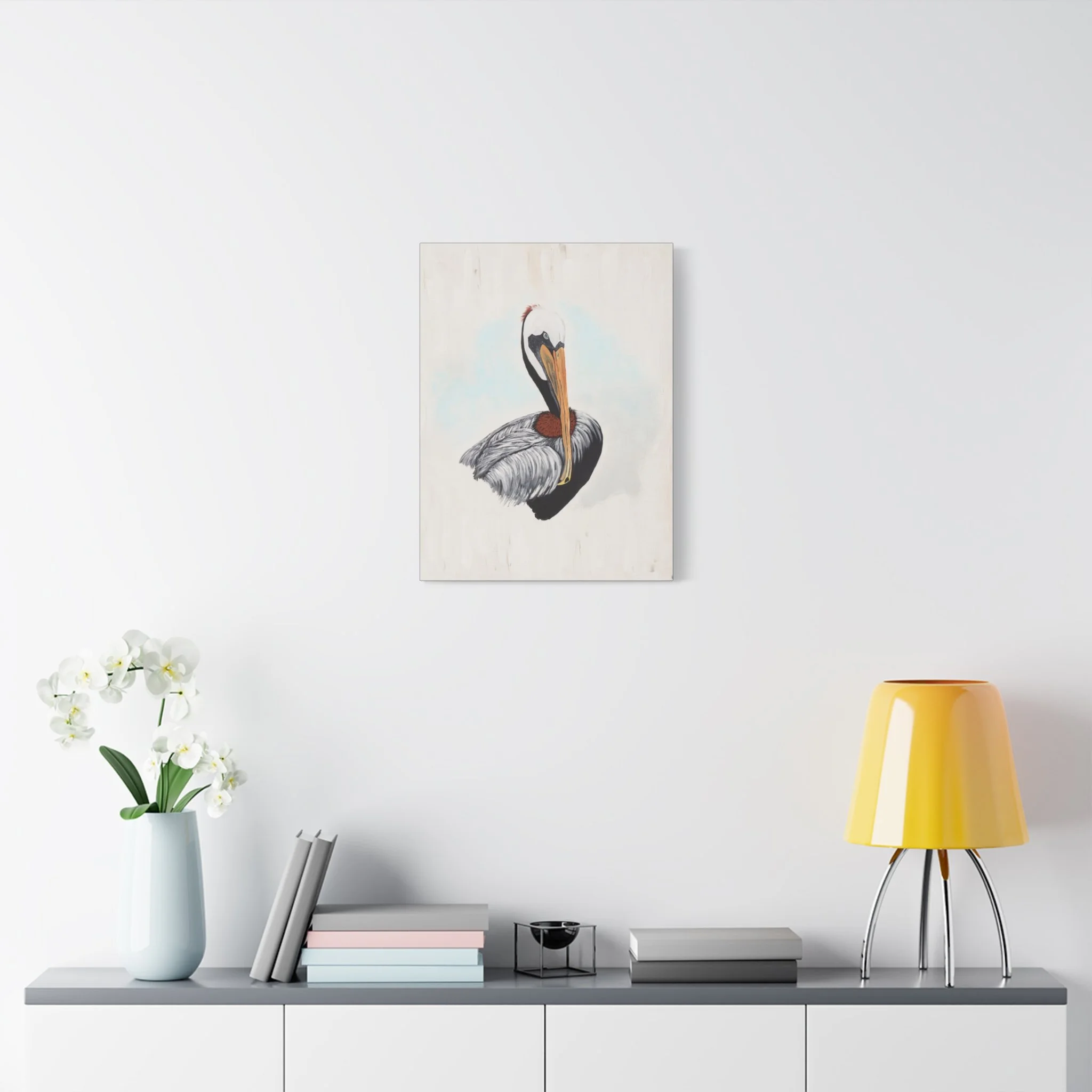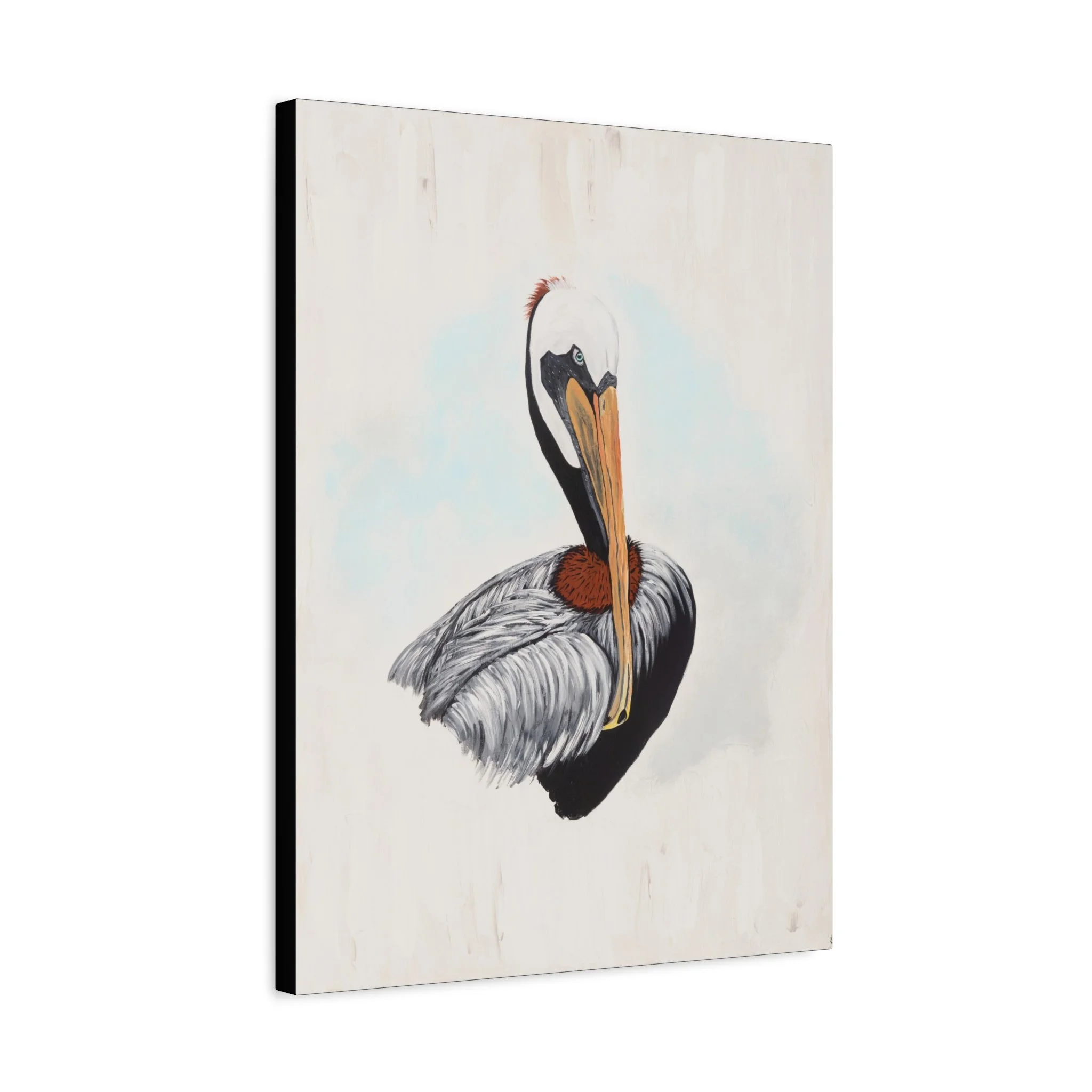 A matte stretched canvas featuring a tranquil pelican portrait rendered in soft, natural tones. The muted background and delicate brushwork let the bird’s elegant profile become the focal point, bringing a calm, coastal mood to any wall. Mounted on a 1.25" pine frame with a matte finish that reduces glare, this piece reads like collected art—quiet, refined, and thoughtfully made. The slim depth gives a contemporary, gallery-ready silhouette that sits close to the wall while still showing subtle shadowing for depth. It’s suited to serene living rooms, beach cottages, or a reading nook where light and texture matter.