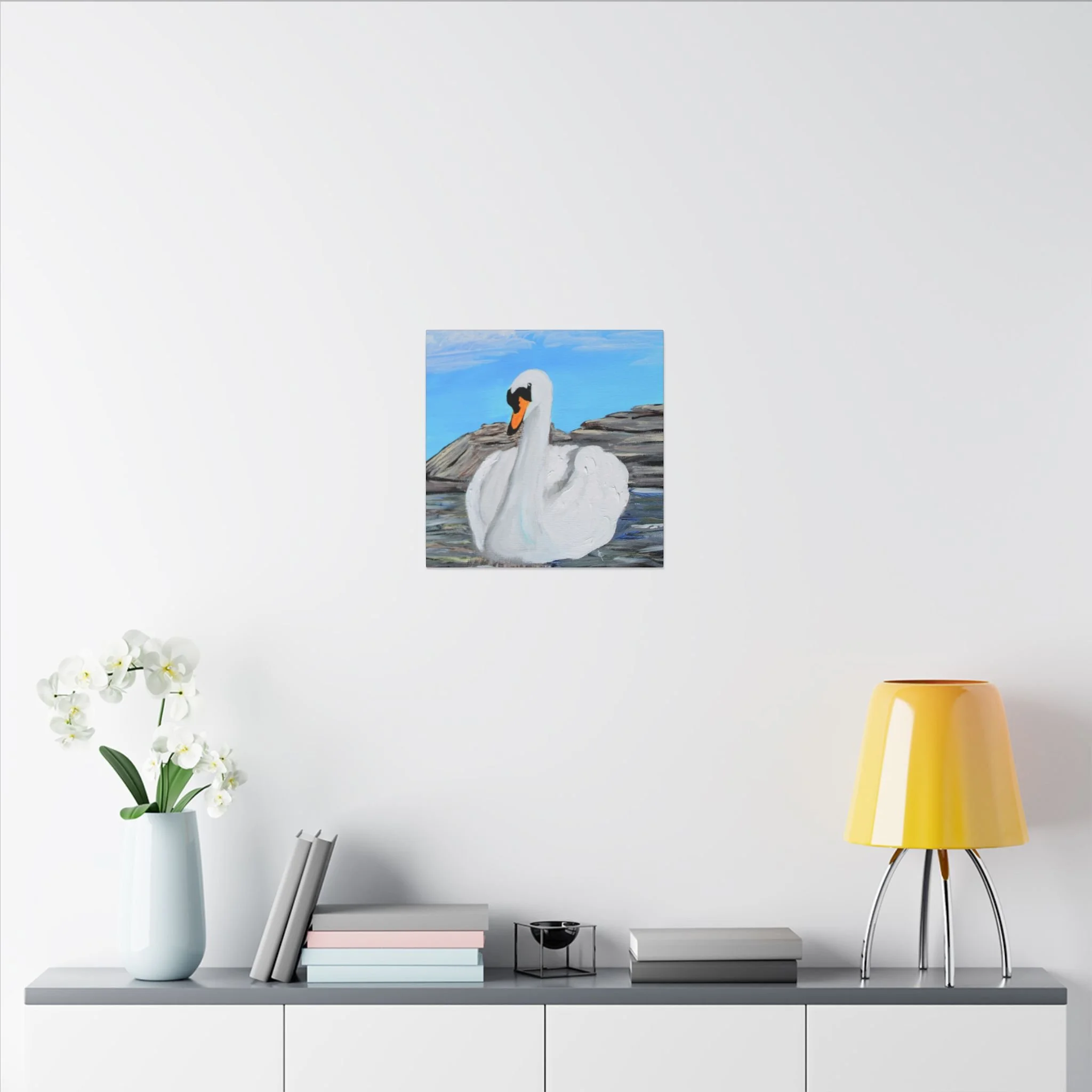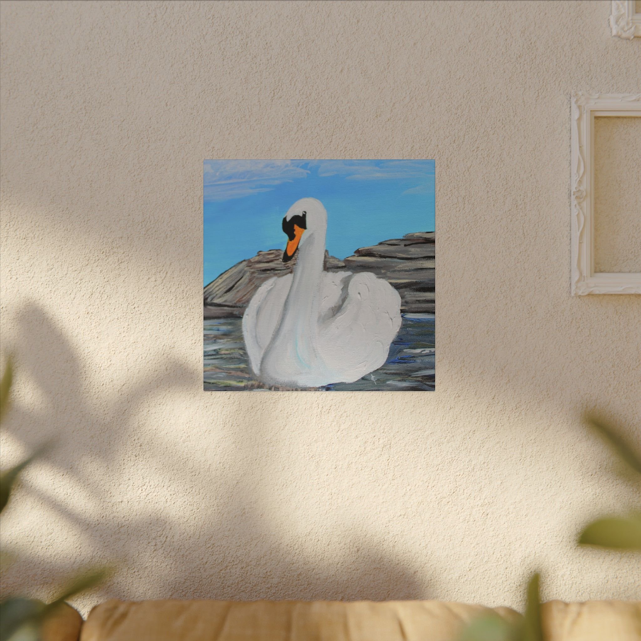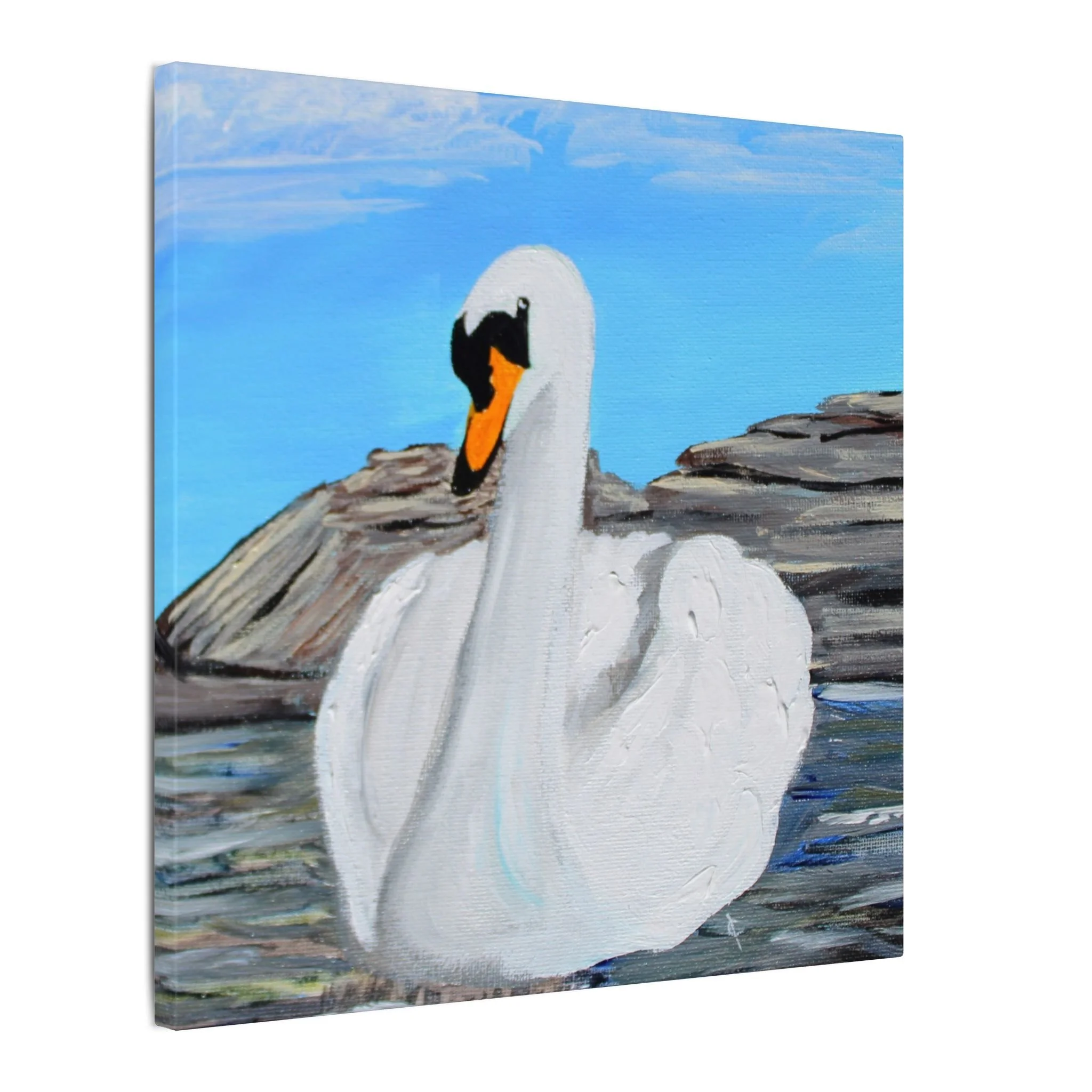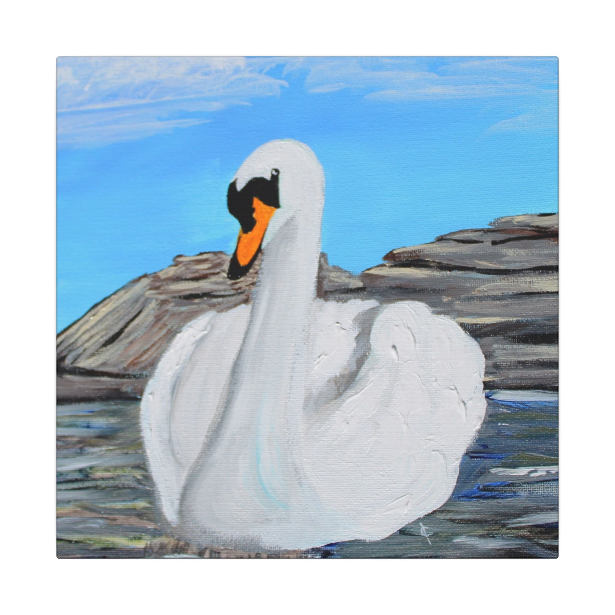 A serene stretched canvas print that brings a quiet lakeside moment into your room. The painted swan floats with gentle confidence against soft blues and rocky shores, rendered in thick, tactile brushstrokes that read beautifully from near or far. Mounted on a 0.75" pine frame with a matte finish, the image retains subtle texture and depth while the durable coated canvas keeps colors vivid for years. It settles easily on a living room wall, an entryway, or a peaceful corner where slow mornings and calm evenings are savored.