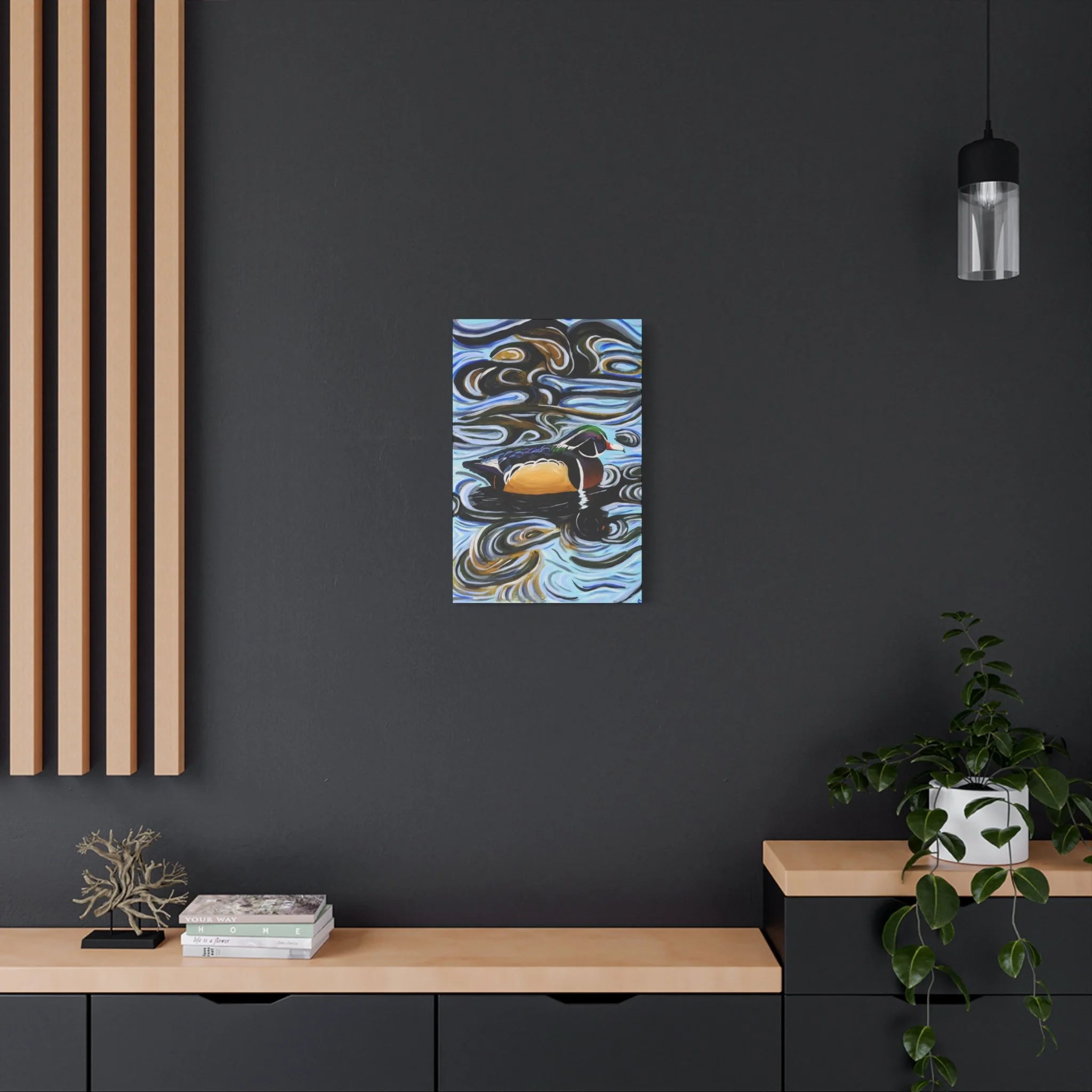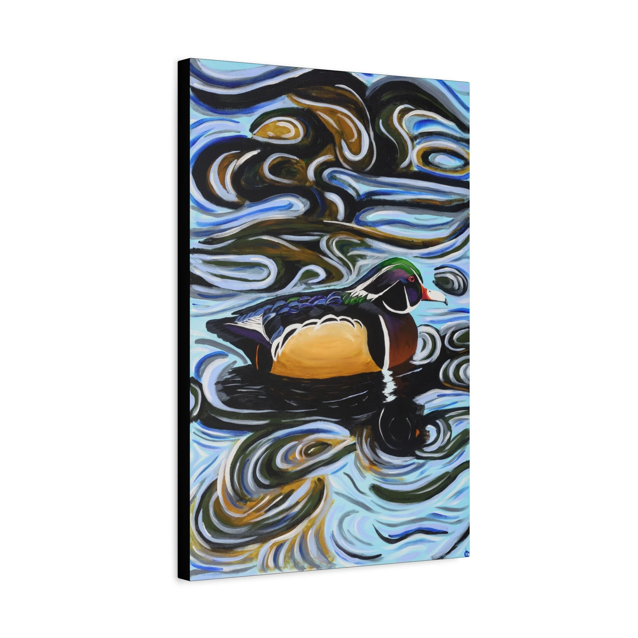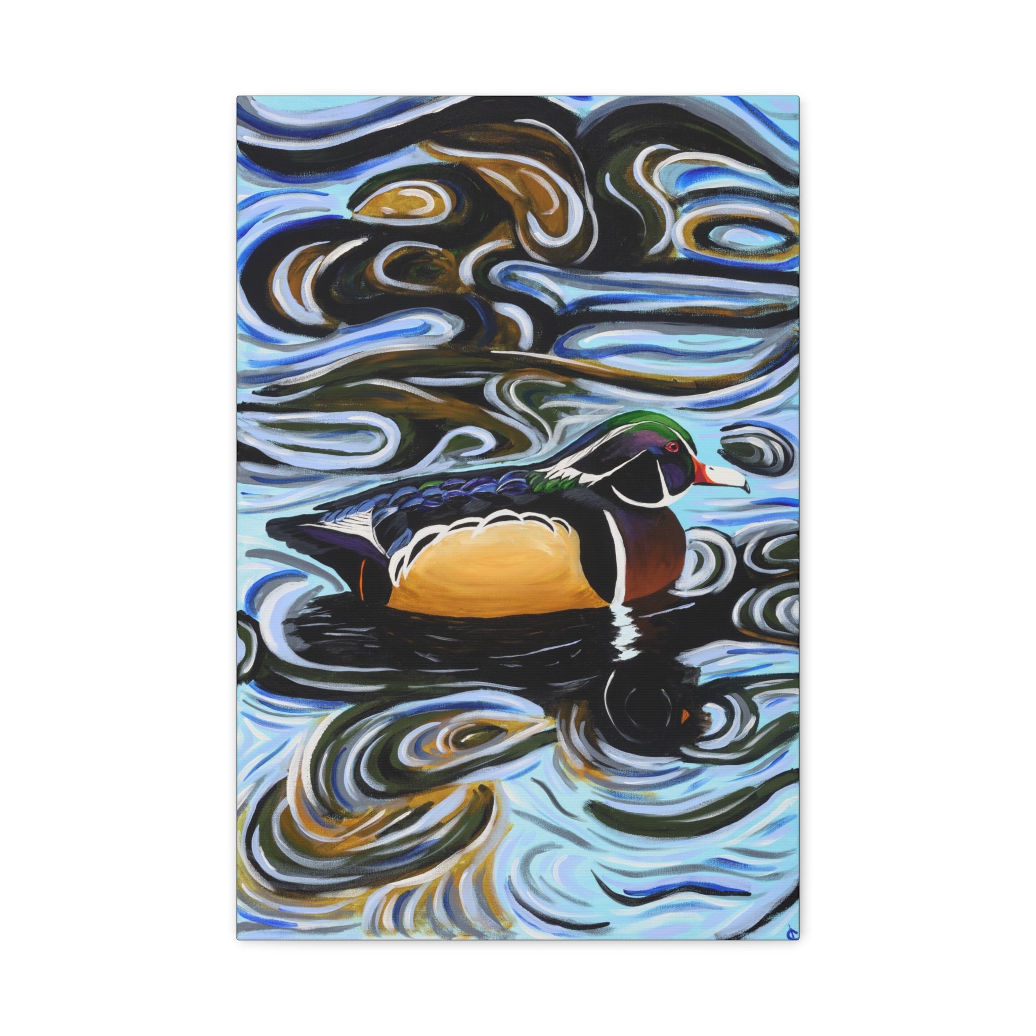 A rich, painterly canvas stretched over a 1.25" pine frame, this artwork captures a lone wood duck drifting through hypnotic, swirling water. Broad, expressive brushstrokes and a jewel-toned palette give the scene warmth and motion—emerald greens, burnished golds, and cool blues blend into a meditative surface. Hung vertically, it draws the eye upward and invites quiet moments: morning coffee beside the window, an entryway that welcomes with color, or a reading nook that benefits from a contemplative focal point. The subtle texture of the matte canvas and the deep-profile frame create gallery presence without overwhelming a space. It complements nature-filled interiors, rustic-modern cabins, and anyone who cherishes wildlife and painterly expression.